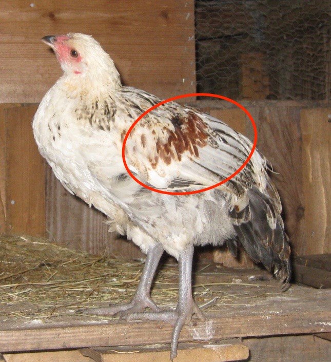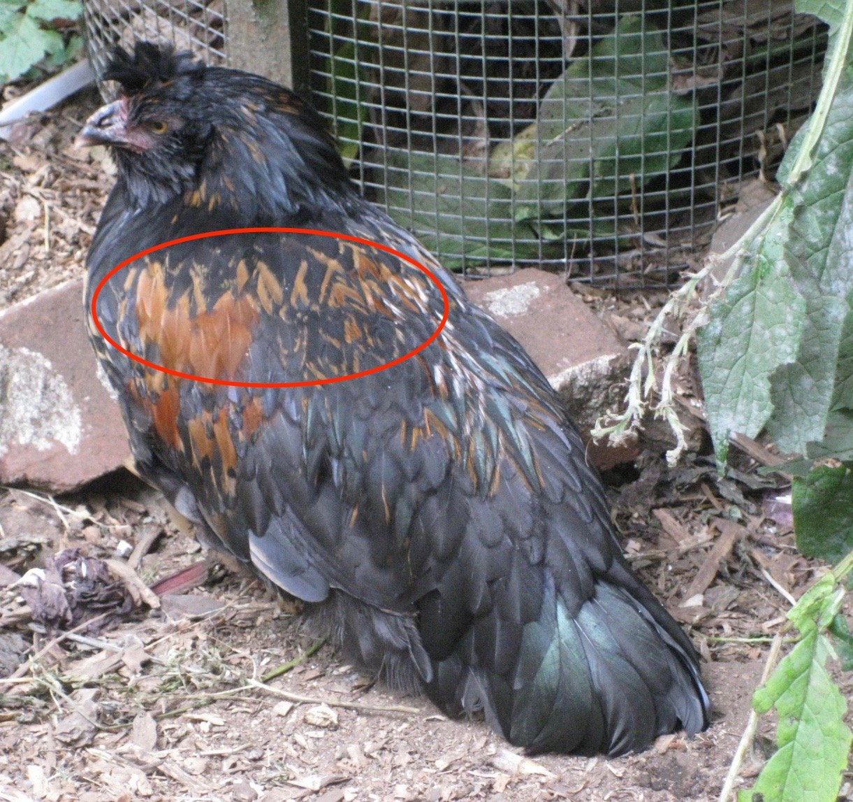Male and female feather patterns are different. Typically this is a trait common to roosters and something to look for when you’re trying to sex your birds. It can start off with one or two feathers and grows over a number of weeks. Females may carry the genes for this pattern, but it is not expressed (not visible) and can be passed on to their sons. If you see patchy red leakage you’ve got yourself a cockerel.