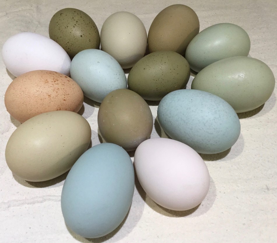 Chickens carry two genes for egg shell colour (one from each parent), either white or blue, and potentially up to 13 genes that influence the brown overlays – that’s why there are so many different shades of browns and greens.