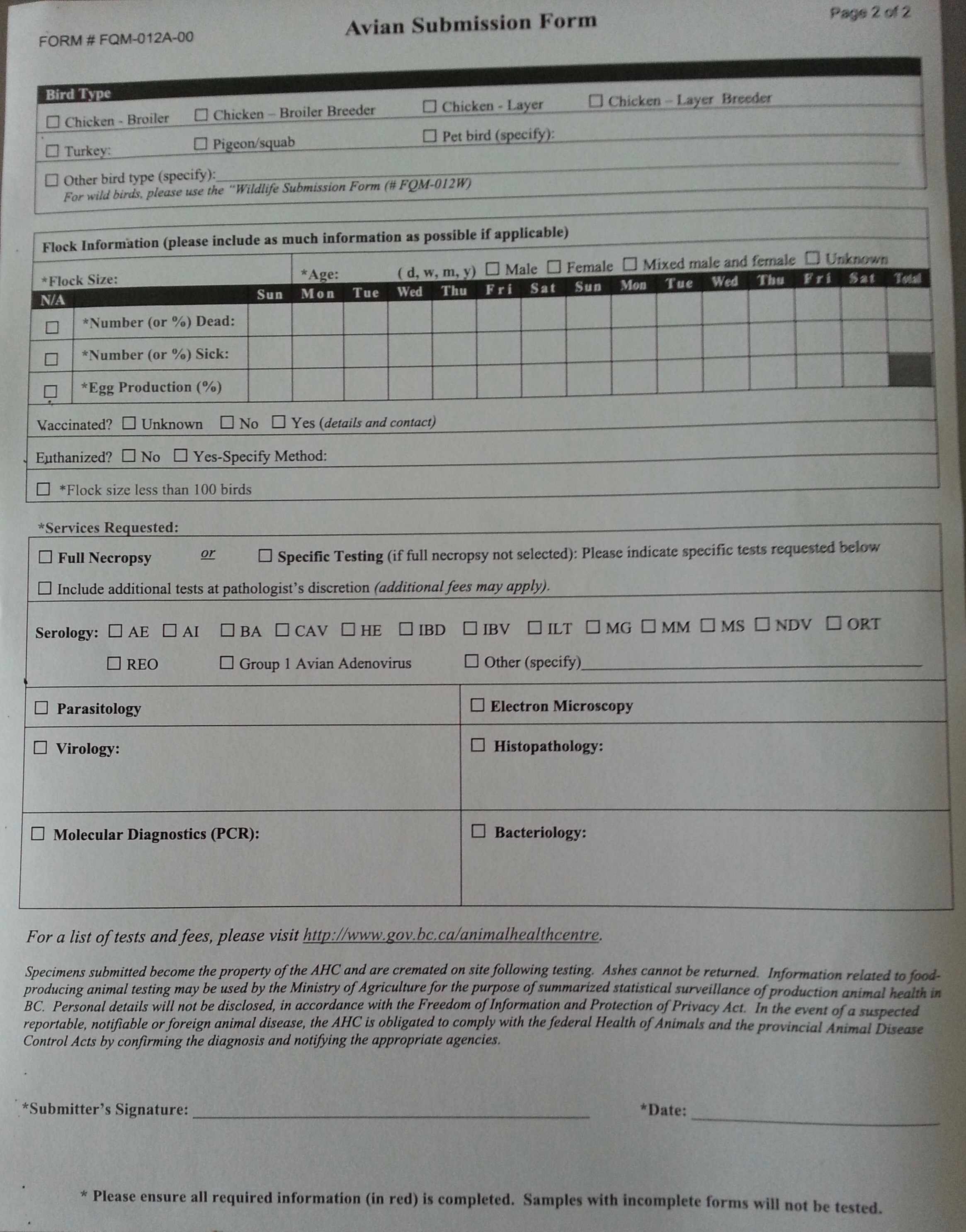 There is a standard submission form which I needed to fill out giving my details and any information about the symptoms of the deceased bird. You can check off boxes for further testing: bacteriology, virology, toxicology and histology. Of course, wanting my money’s worth I checked them all. They don’t do everything imaginable, but select the most likely tests applicable to the specimen they are working on.
