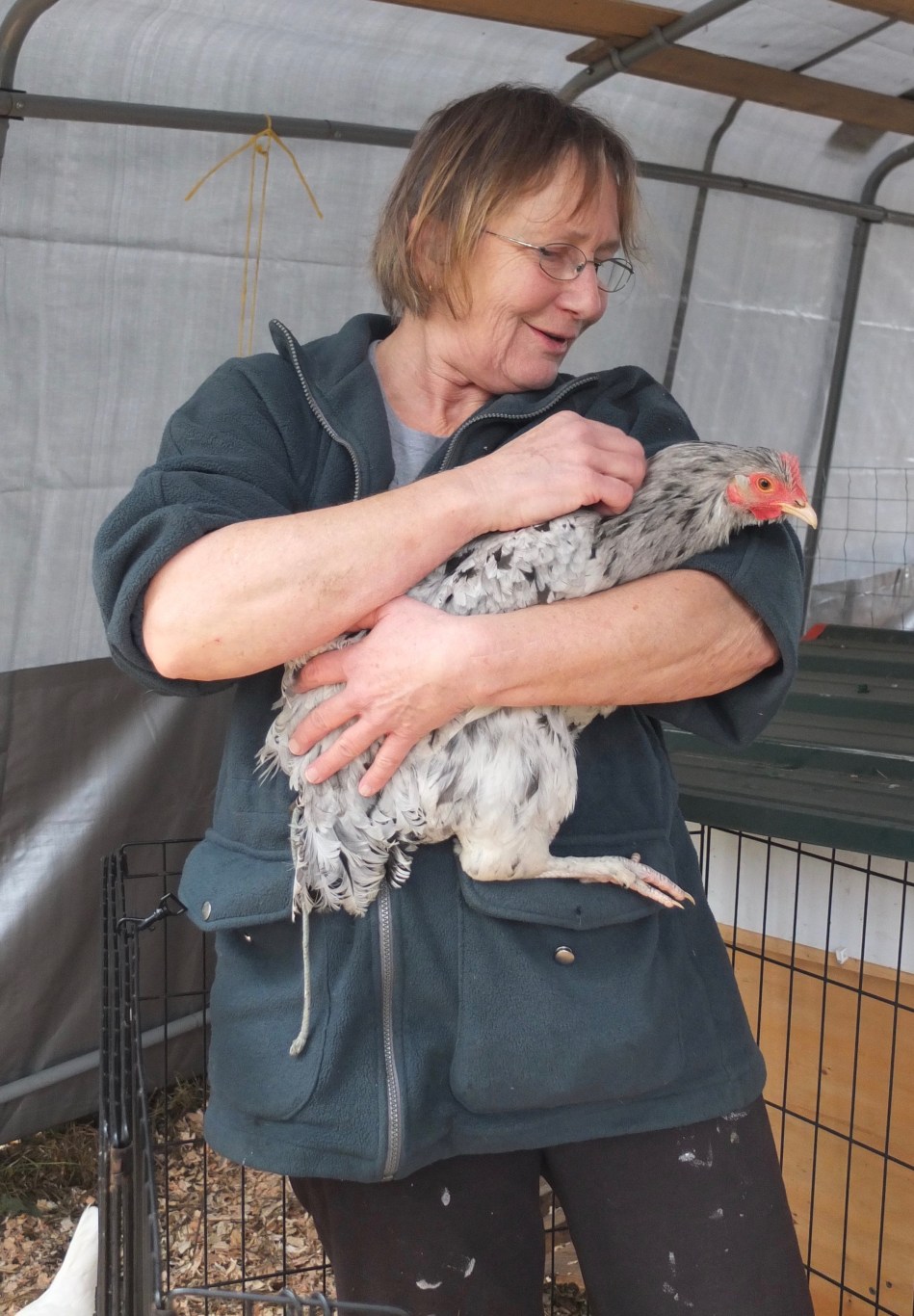Last summer she got three pullets from Grade Eh Farms: Bresse, Splash Marans and Bielefelder. Just three, which is enough to keep her in eggs and just the right number for the freecycled housing she’s cobbled together. One of the coops is mounted on a wagon that she can easily move about the property – any larger and it would be more arduous. I don’t think she’ll be a victim of chicken math – she loves her birds, would like more, but is realistic in what she can reasonably manage.