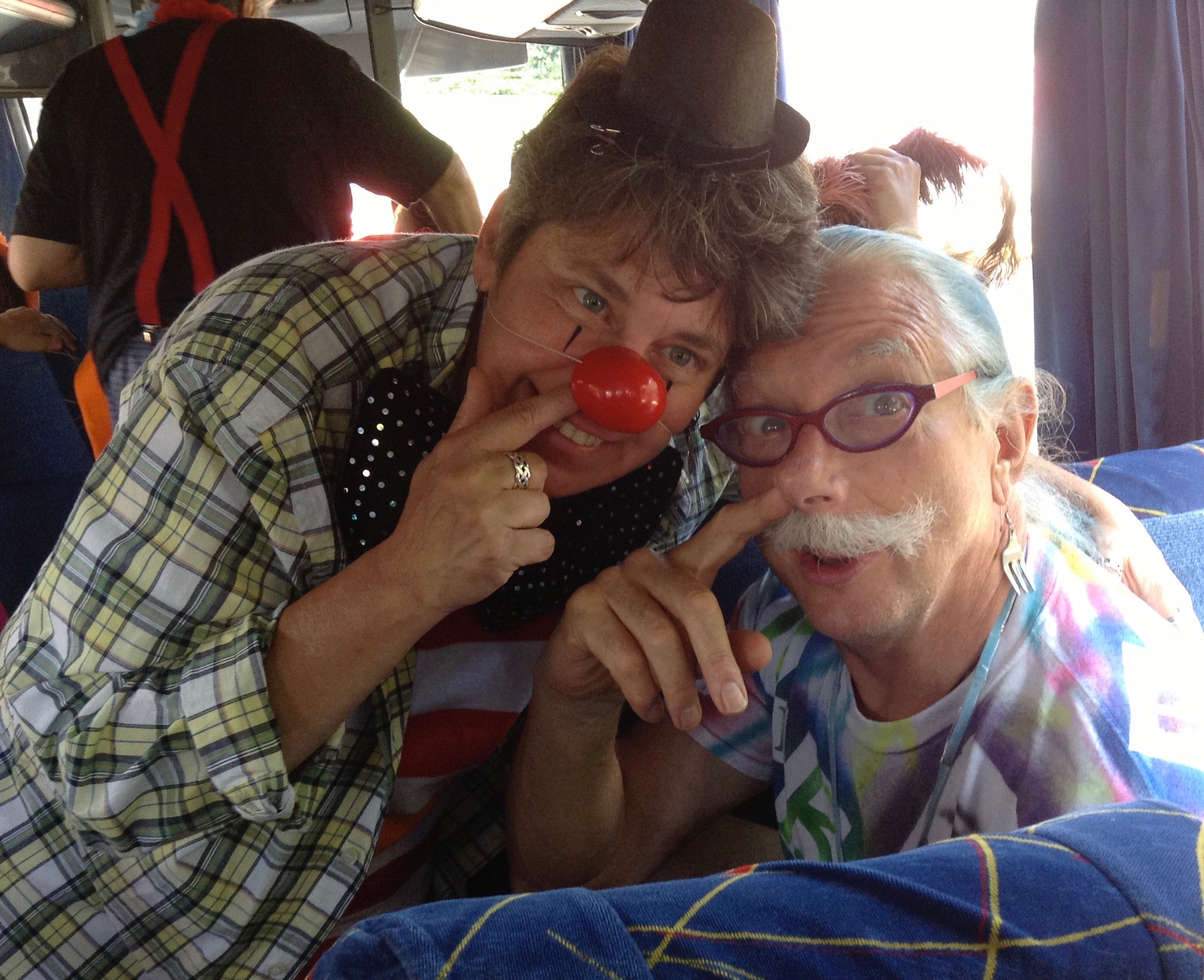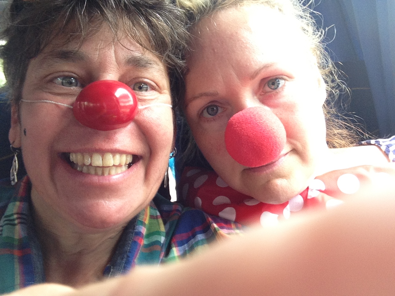 For her 50th birthday she didn’t go bungee jumping or sky-diving but undertook something equally as daring: clown school. Yup, she trotted off with her then-partner, Vee, to Costa Rica for two weeks of workshops hosted by Patch Adams. You remember him, the unconventional physician played by Robin Williams in the movie version of his days at med school. The basis of Patch’s philosophy is caring for and connecting with others, rather than just performing in order to ease suffering. The student clowns learned exercises in how to do that even when working with folks that don’t speak the same language, then volunteered at community hospitals and a psychiatric ward.