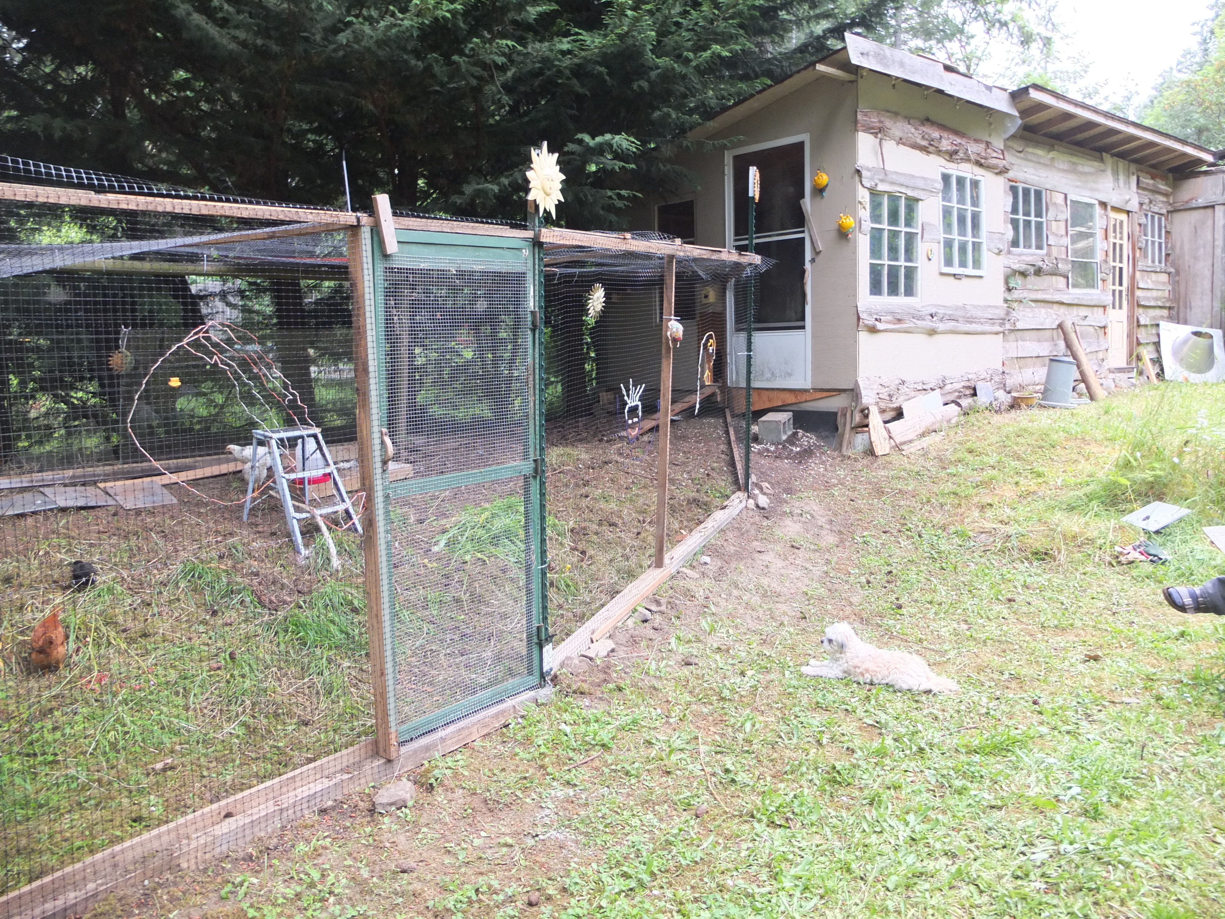 Pounding the fence posts was a little more difficult. A few friends formed a work party and enclosed an irregular-shaped 25’ run with an automatic door into the coop. She ordered it online after she’d had a couple of drinks. Cathy quipped that they should have breathalyzers on those sites as the next day she was hit with buyer’s remorse. When I dropped by to chat with her she’d only had her four pullets for less than a week and already had a change of heart, deciding an automatic door was a good thing.