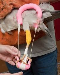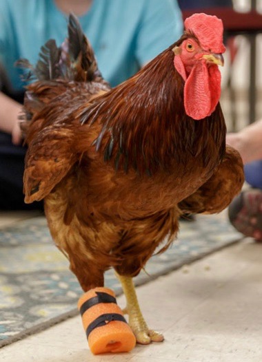 The rooster was being fitted for a prosthetic foot on the pool noodle side. He lost his foot and toes on the other foot due to frostbite. I used the photo as an illustration of how a pool noodle could be used as a splint.
