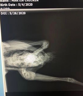Check out her broken leg (red line). Notice the .22 shell casing lodged in her abdomen? Somewhere along the line Clara ate it and it’ll probably be there for the rest of her life. Be careful with nails, screws and metal bits because your flock will eat them too.