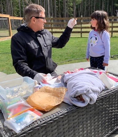 Rachel got some expired human-grade wound packing and colloidal silver gel and began to irrigate with saline and debride (remove) the dead flesh with small scissors and medical tweezers.