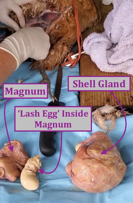 All the components of unlaid eggs accumulate and fester in the oviduct, filling it with a smelly, rotting mass. The telltale diagnostic clincher is the production of a ‘lash egg’: the passing of an egg-shaped mass of hardened pus, tissues and bits of unlaid eggs. If the hen is unable to pass the mass it will continue to accumulate material and may affect her ability to breathe. Read more.