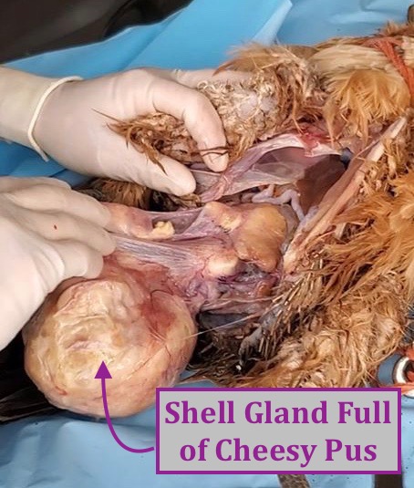 Salpingitis may be the result of a number of different issues – vent gleet being one of them. Penny came to Jessica with mites and was not in the best condition. The stress of integrating into a new flock and other health issues can make a bird more vulnerable to various pathogens. The longterm inflammation in her vent and reproductive system became a medium for a bacterial infection in the oviduct. Penny never passed a ‘lash egg’. Her oviduct and shell gland were full of cheesy pus that became walled off and too large to pass, filling her abdominal cavity.