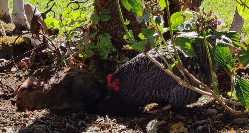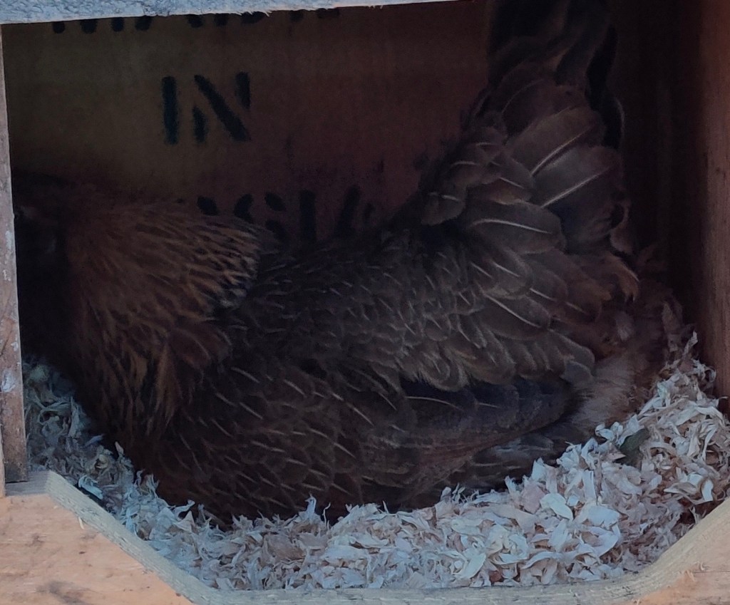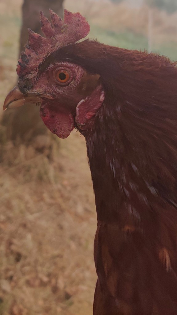 Ash’s face, wattles, and comb were still pale because of the new skin. She laid an egg the day after her arrival, then stopped for 12 days before starting to lay again.
