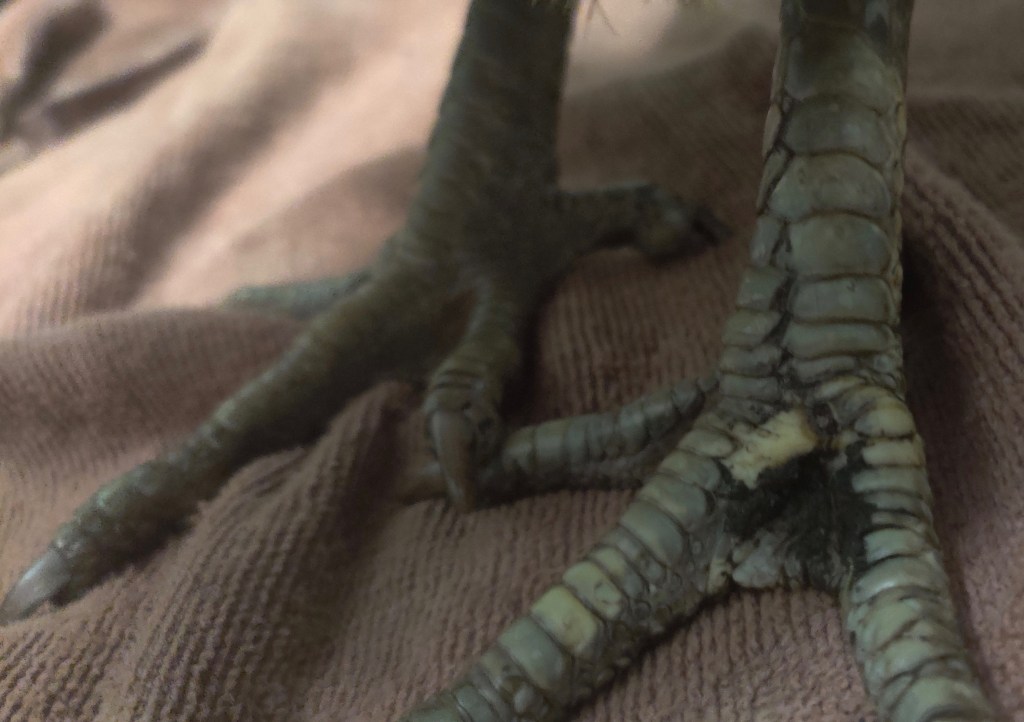 Easter Egger Ember’s scales on her legs and feet started to peel off and she was able to walk around with her sister.