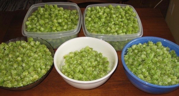 I found hops incredibly easy to grow. They like well-drained, rich soil; full sunlight and 120 days of growing season. The recommendation is to train them on vertical poles or string so that at harvest time you can cut them at the base and the whole plant – which can reach 20’-25’ in a season – drops to the ground. I made the mistake of growing them on a 6’ high fence and then weaving them in and out of the mesh, which was more work to extricate them at harvest time.