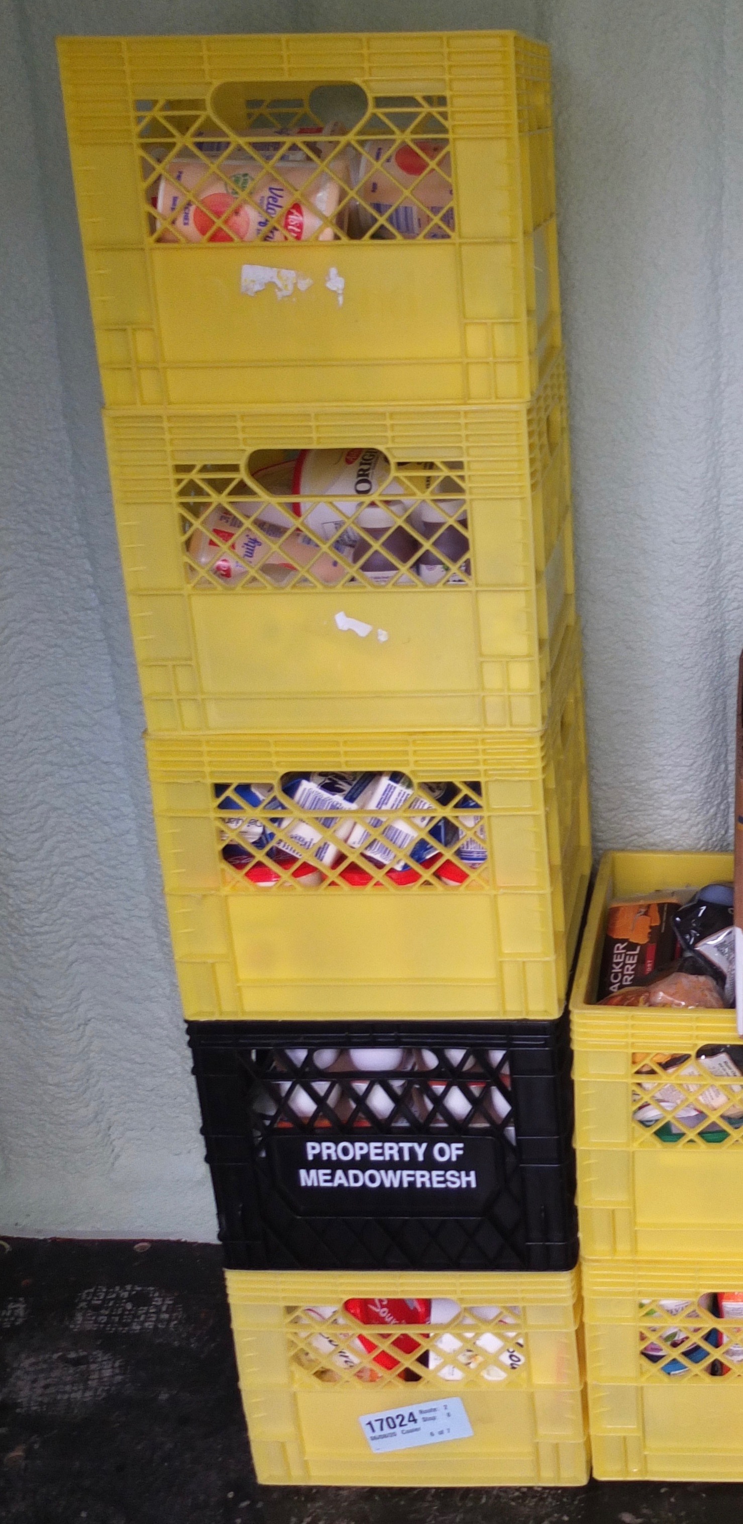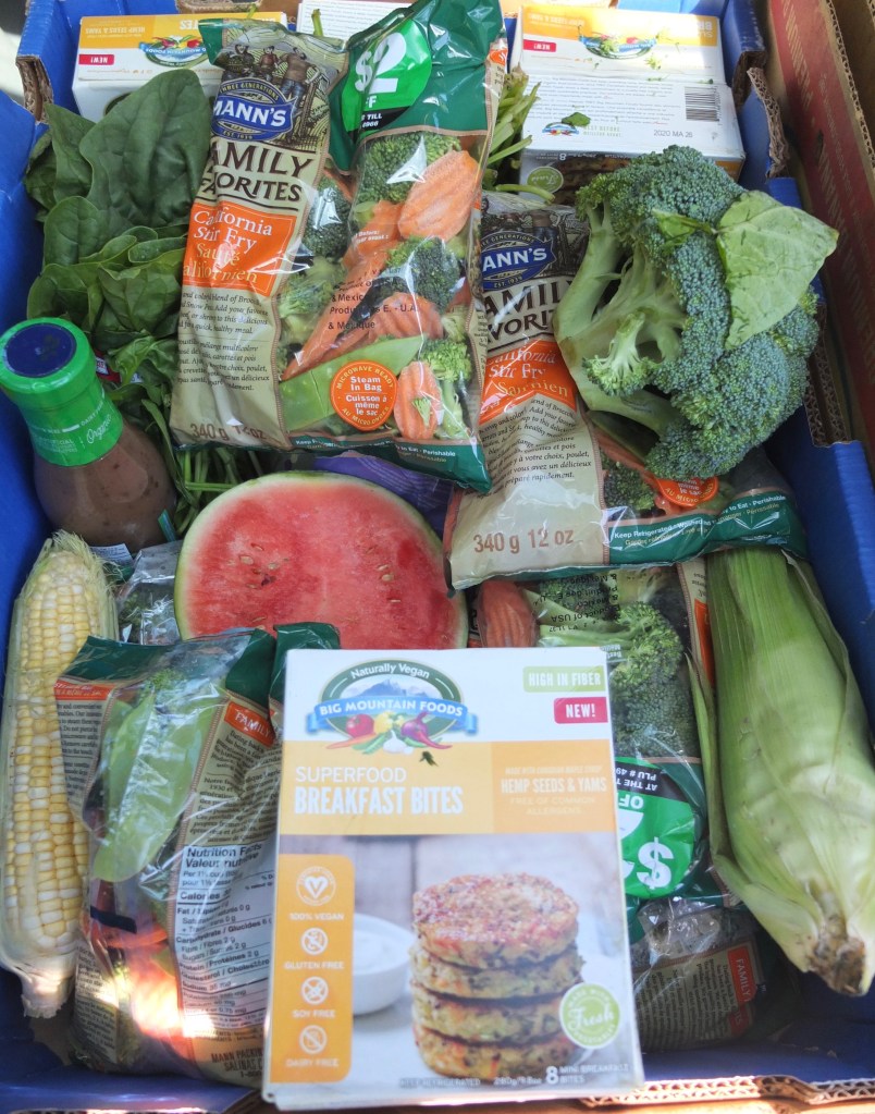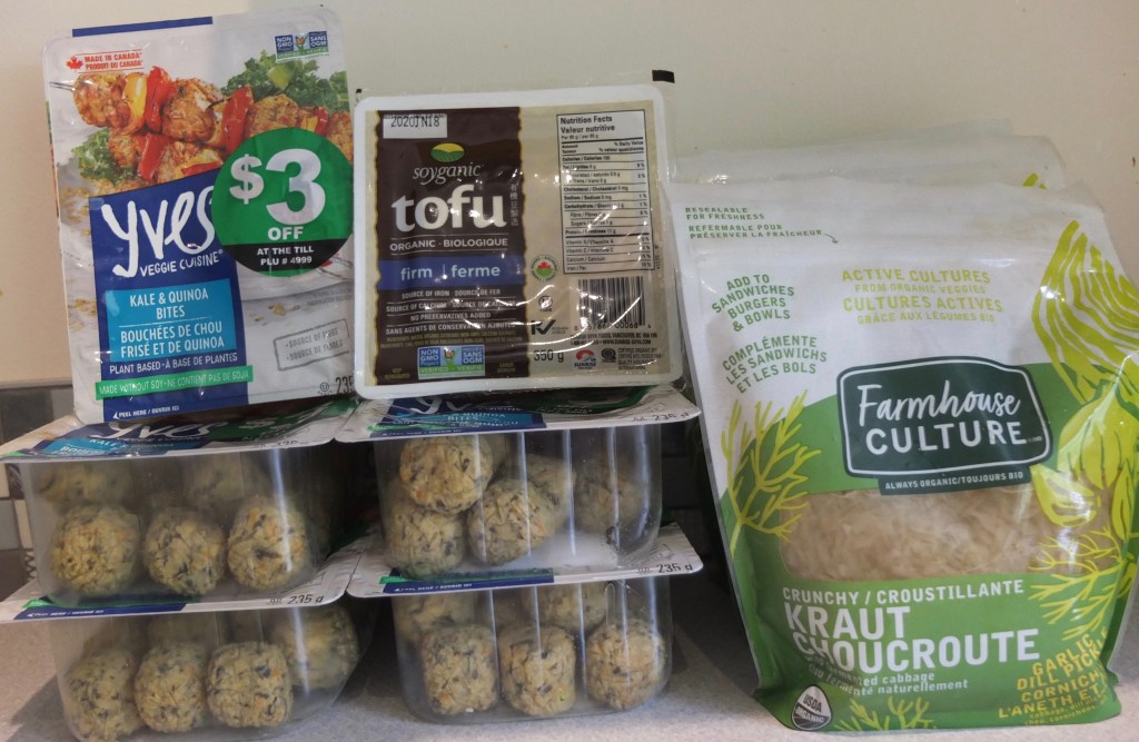 - 72 packages of tofu, 52 packages of veggie burgers/hotdogs, 12 loaves of bread, 22 containers of yoghurt