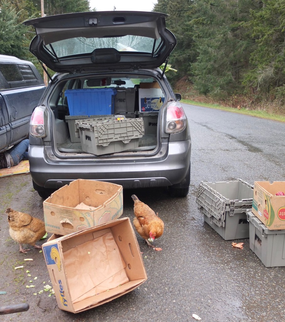 This was my last pick up of the year: 12 totes full of hundreds of pounds of unsold produce and 10 boxes of dairy (e.g. yoghurt, buttermilk, milk and cheese). Ordinarily it would go to the food bank and the food programs on the island, but because of the holiday closures my friend Thomas and I sorted it into three categories: people, animal (e.g. chickens, pigs, alpacas) and compost and distributed it all. The 17 cans and 4 bags of pet food and the bucket of ashes will go to my flock.