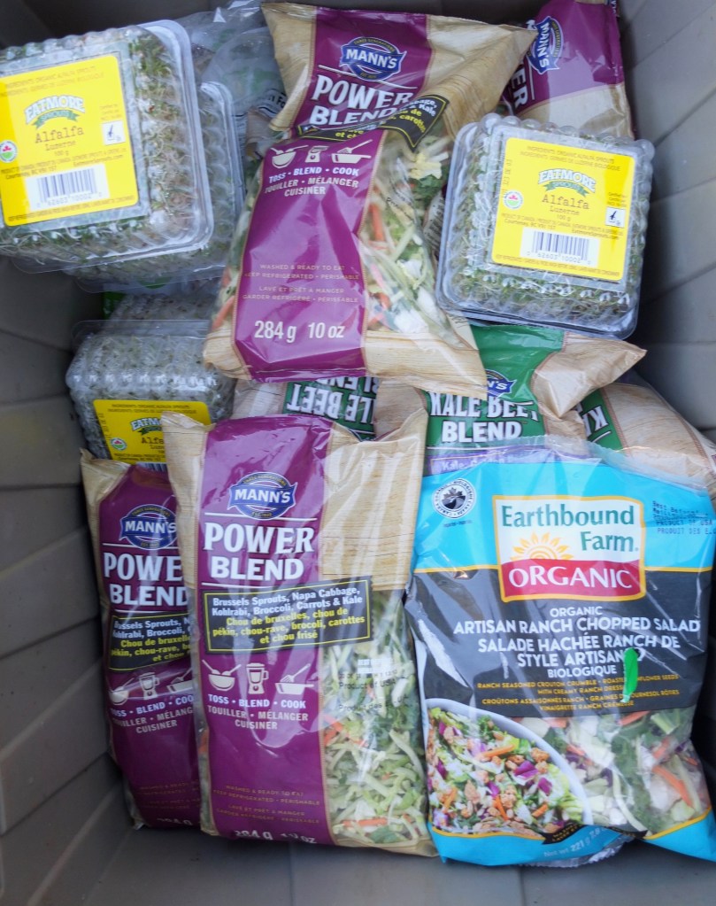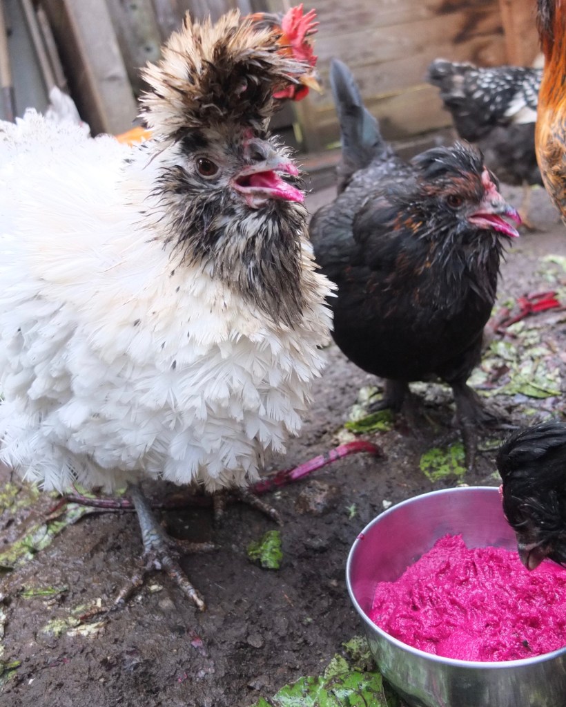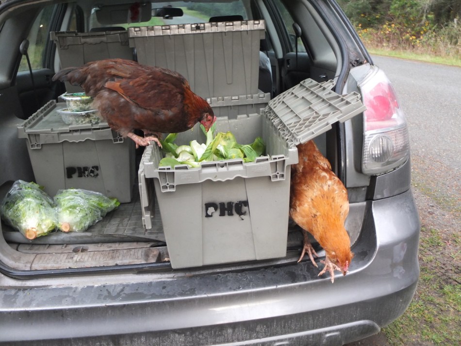 I deliver eggs to one of my customers, a single senior who doesn’t drive. She leaves the money in a bag by her gate and I drop off the eggs. She doesn’t always get around to eating the produce from her farm box program or have room in her fridge so my flock (and my partner and I) have been the appreciative recipients of her downsizing. There are usually some treats in the bag: packages of pasta, beans, rice and oats; fruits and veggies, cheese and yoghurt, tofu and tempeh. My dog got the dried seaweed. When she had no room in her freezer she passed along: spot prawns, lobster tail, halibut, chicken breasts, lamb chops, burgers, ground beef and smoked salmon.