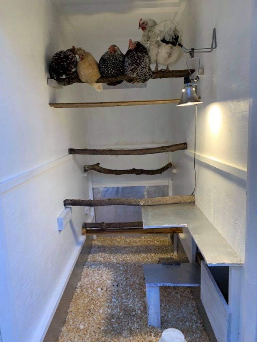Once recovered, Gerald built a more modest 4’x 8’x 8’ secure coop: he’s put sheet metal on the floor and on the bottom two feet of the walls for ease of cleaning, insulated the walls and ceiling, installed hardiboard on the underside, exterior nest boxes and a glass/screen door for light and ventilation.