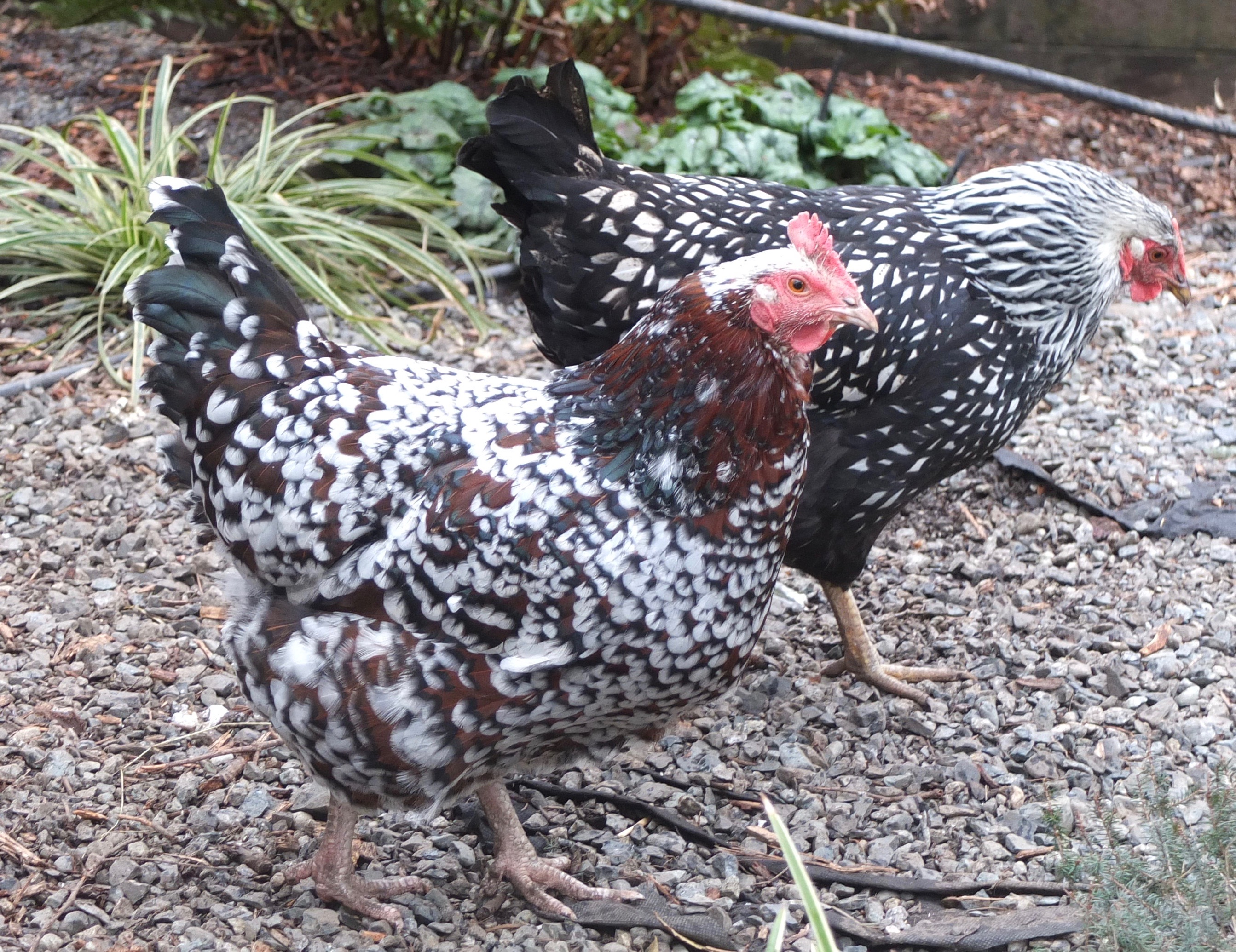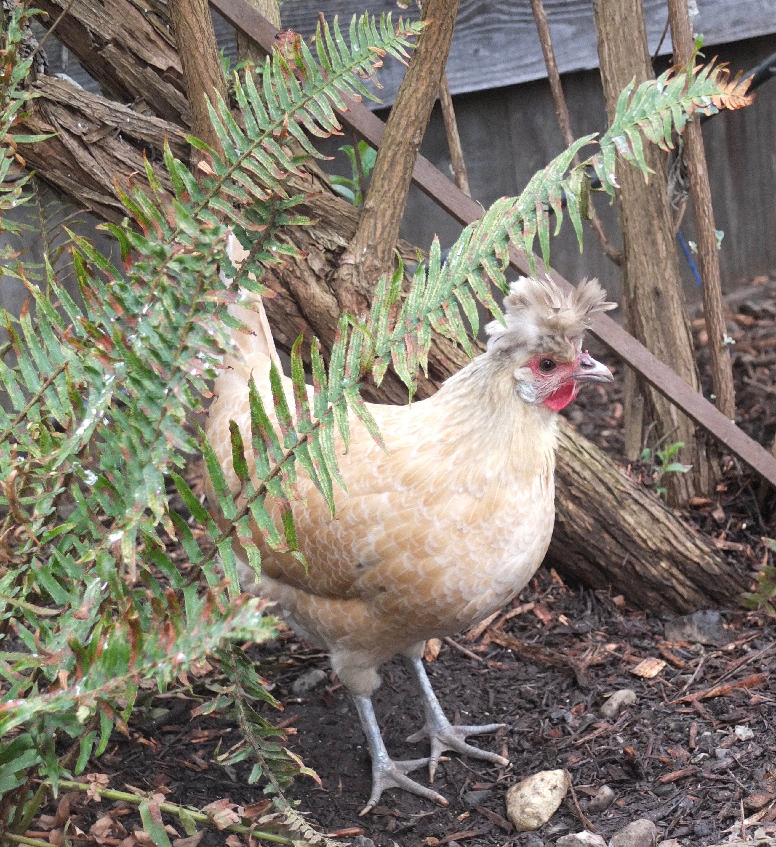 They were lucky to have picked up a free flock of seven heritage birds from folks who were moving off island. Two were lost to predators, but they still have five of the originals: Buff Laced Polish, Silver Laced Wyandotte and Speckled Sussex. The hens have ½ acre to free-range on, which is large enough to prevent them from damaging the gardens. As we toured around their lot I was surprised that their birds were so docile and were totally at home walking around with a stranger. Most birds, even my own, aren’t comfortable with folks they don’t recognize.