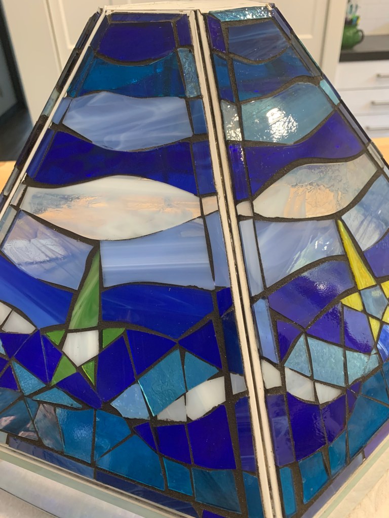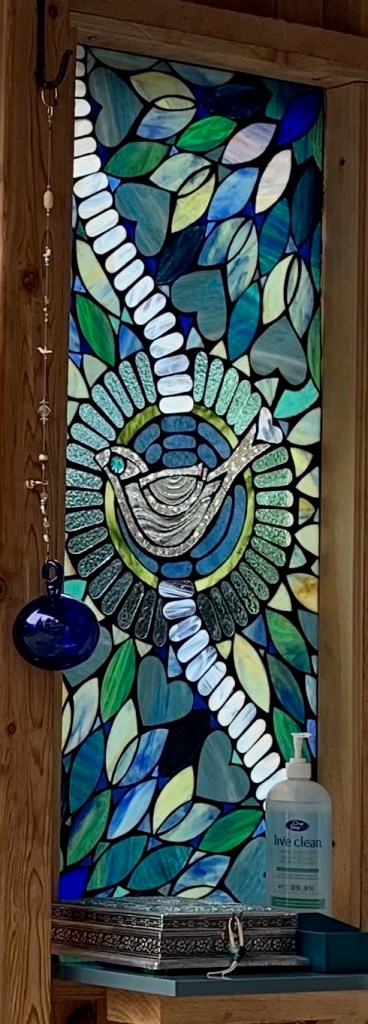 Two years ago, he embarked on building a coop. Before it was finished, Gerald fell off a ladder and damaged his lower back and leg. His recovery was slow, so they hired someone to complete the job. The coop became larger and fancier than originally planned and along the way it morphed into Sara’s studio where she does glass-on-glass mosaics.