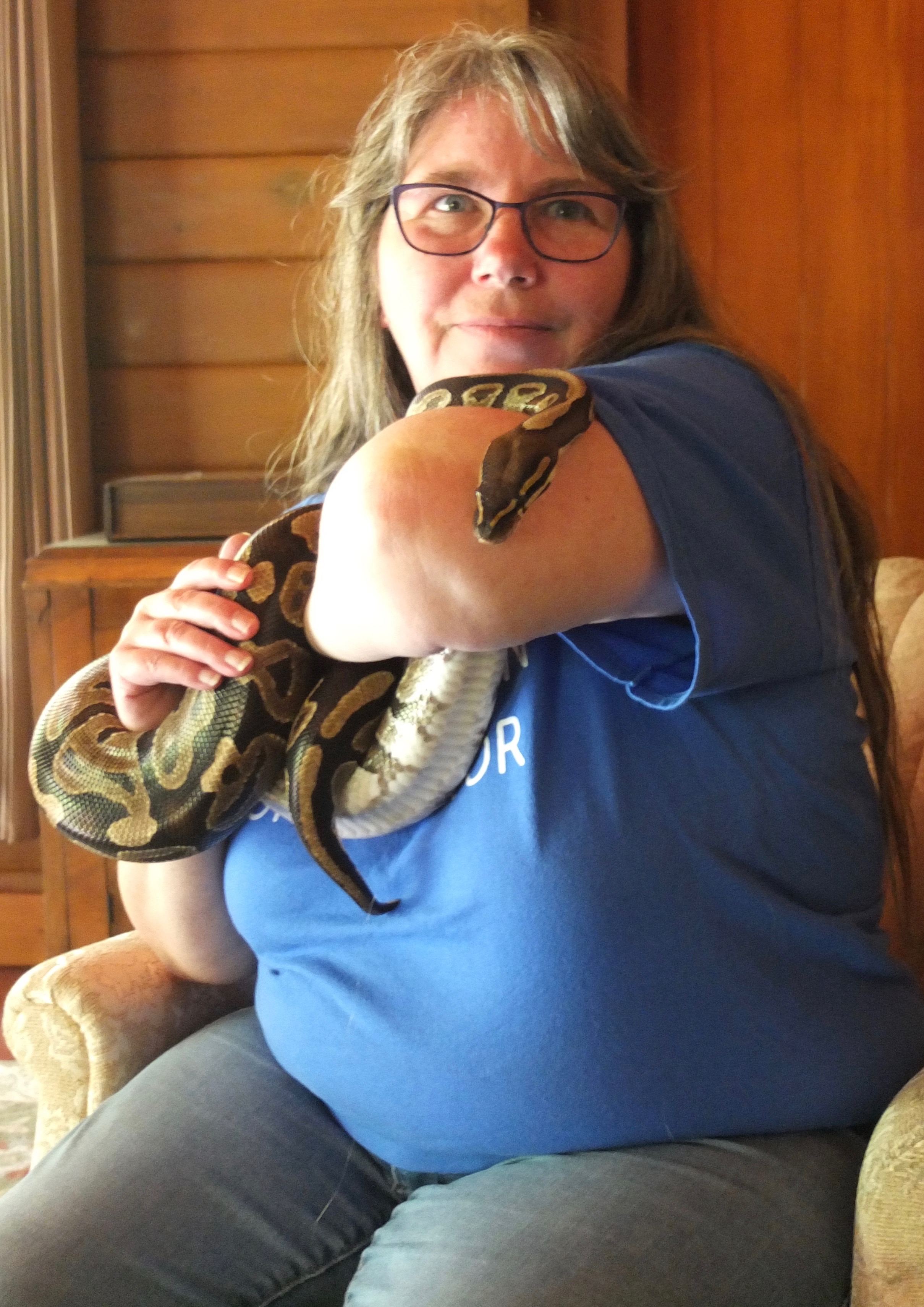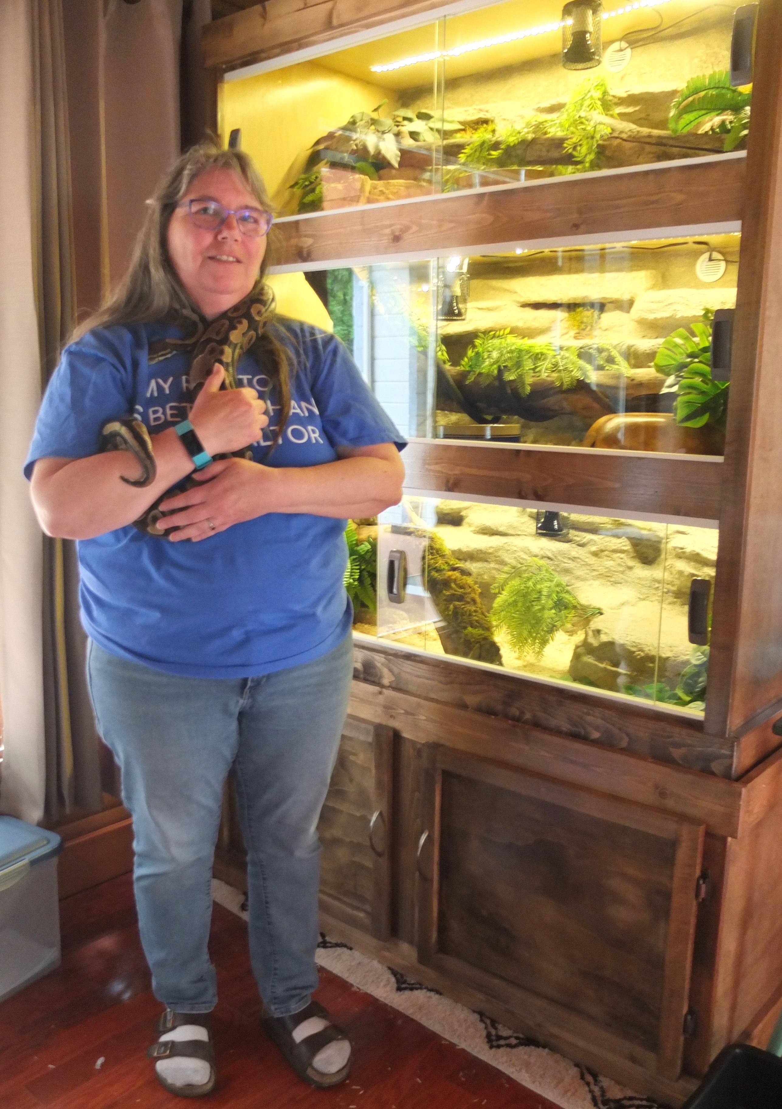 In 1994, she rescued her first iguana, who had been housed in a filthy cage that was so small it had to be dismantled to get him out. In addition to neglect, he had a broken leg that needed repair. Over the next 25 years she took in hundreds of lizards, snakes and turtles. Her reptile rescue became a registered non-profit charity in 2003 and took over the basement of their house, which was filled with cages and tanks, all temperature controlled for cold-blooded creatures. She quipped it would be well suited for me, reminding me of how hot my house had been when we first met. What can I say? I like to be toasty.