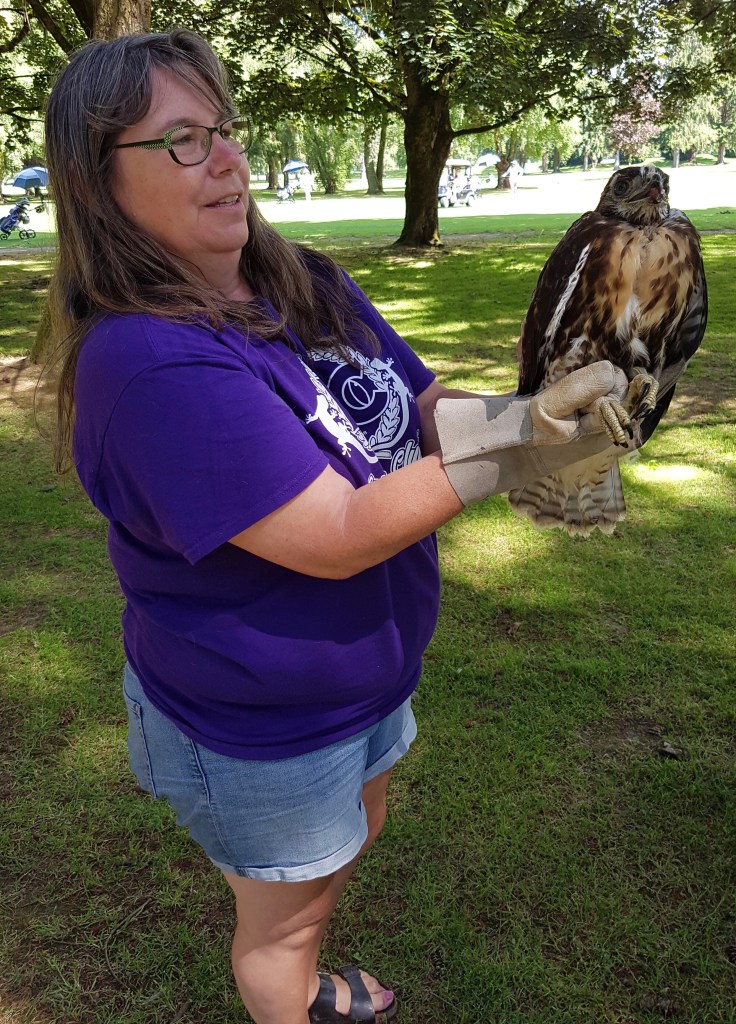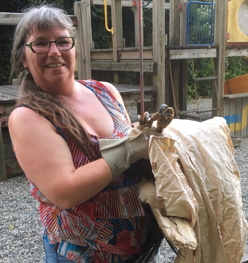Before reptiles, Val was involved in raptor rescue when they lived in the Lower Mainland. In the early ’90s she started volunteering with OWL, an organization that rehabilitates eagles, owls, hawks and falcons. Her first jobs was cleaning cages and cutting up dead rats as meal prep. In 1995 she was hired on and later was promoted to supervise bird care. They trained volunteers, educated the public, and took unreleasable birds into schools. The highlight was when injured or orphaned birds, once able, were returned to the wild.