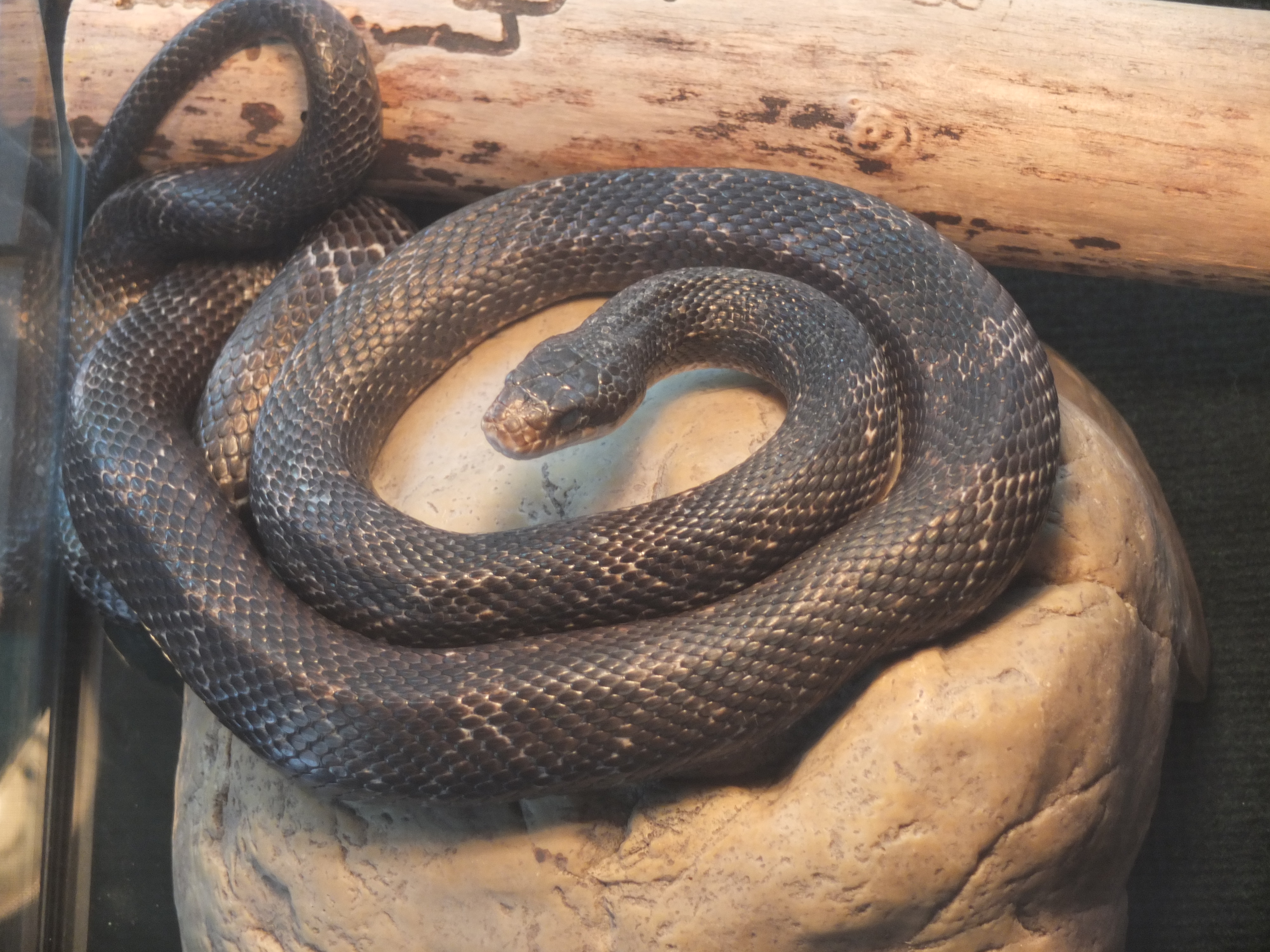 We grabbed two chairs, socially distanced, and sat down to chat. I couldn’t help but notice that one wall is filled with a 4’ x 7’ three-tiered terrarium, each containing a sleeping Ball Python. A tank on another wall houses a Rat Snake. As someone who loved catching salamanders, turtles and snakes as a kid I was unfazed. The three pythons were hiding under rocks and don’t usually come out till dusk, but Val brought one out for a slither. Apparently they only eat twice a month – a dead rat which Val buys frozen – and pass one poop per meal. The Rat Snake is more active, and therefore eats and poops more. Rounding out the menagerie is a Russian Tortoise and some interesting insects.