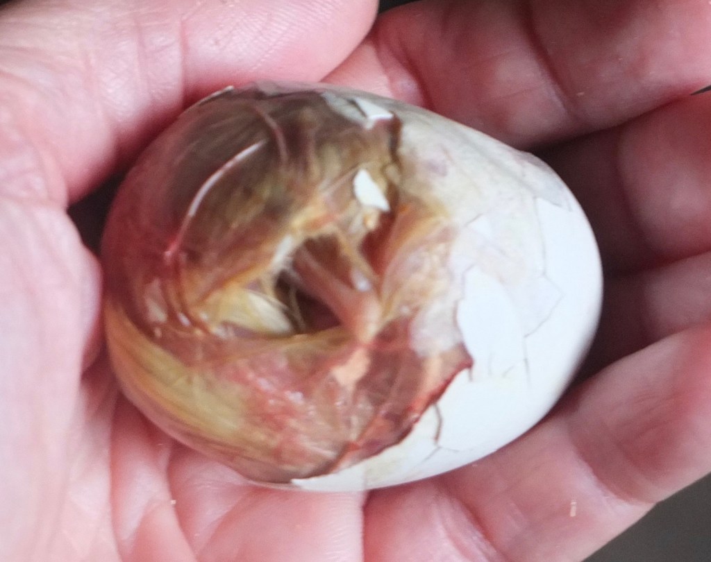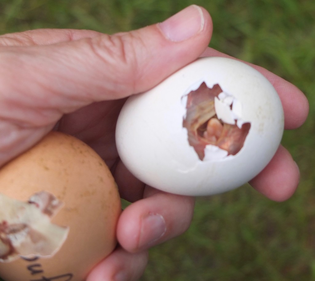 I’ve had 66 hatches with broody hens over the last decade. Most have gone according to plan, some with sad endings of chicks that died before hatch or even worse, just as they were hatching. A few times I’ve managed to find externally pipped eggs, those that have cracked an opening through the shell, that needed help. It’s always a dilemma about when and how to intervene. My guiding principle is to assist if there is no alternative and the chick has a will to live. My experience of happy ending outweigh chicks that didn’t make it.
