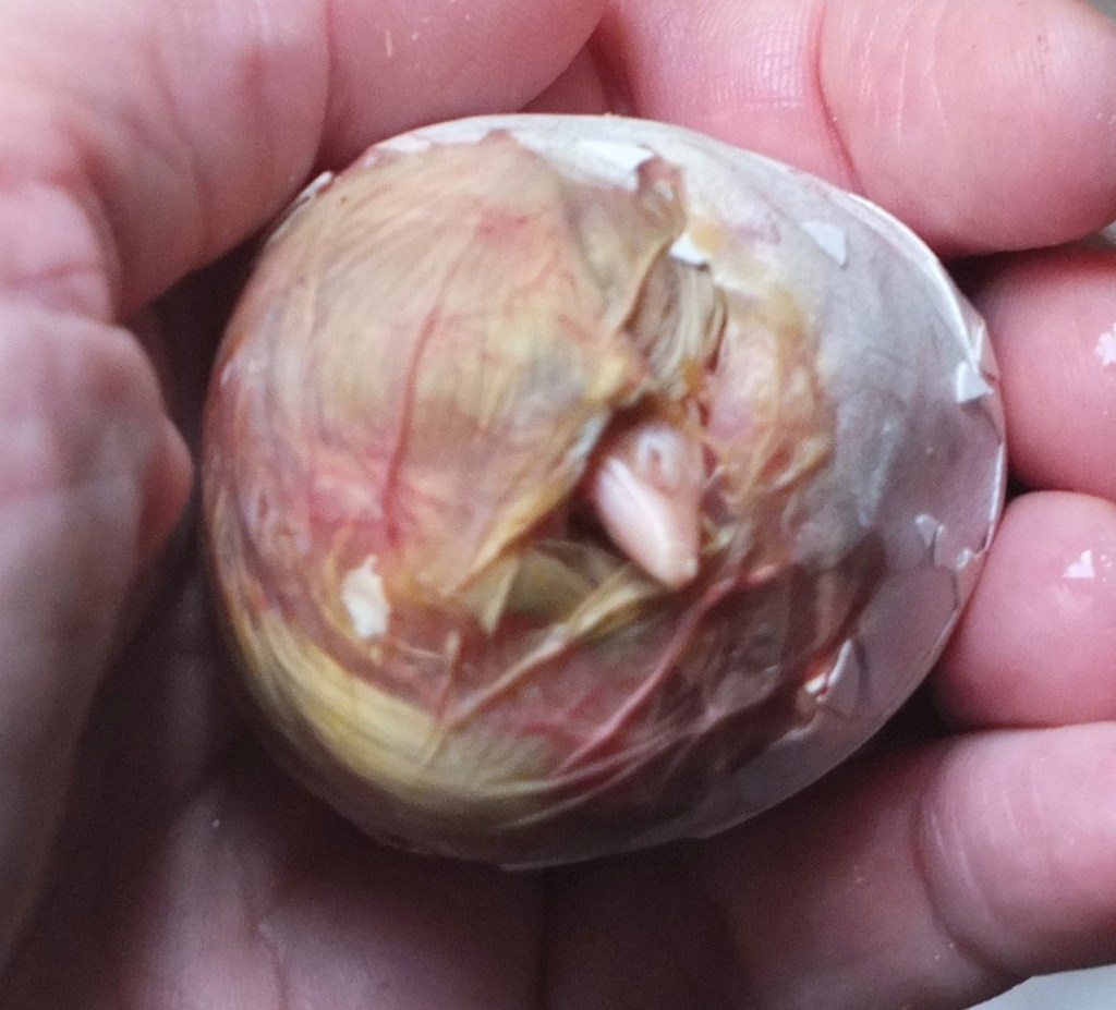Chick 1 had dried blood inside the shell as well as a patch on its abdomen. Shona was tucked up with her chicks for the night so I placed the two back under her. I cracked open the two that didn’t pip: one was unfertilized and the other had a fully developed embryo with an unabsorbed yolk sac, who I estimate died on @ day 18-19.