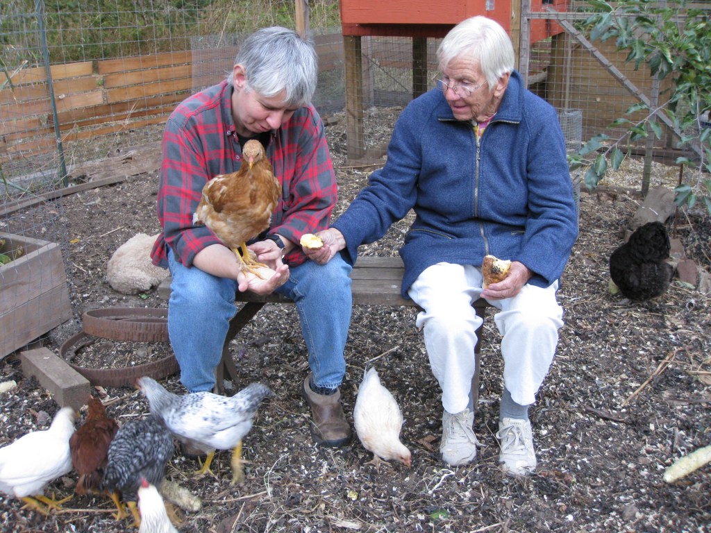 Our property included a 1940s log homestead and a 1960’s cottage, both in need of work. We did all the interior demolition ourselves and lots of the unskilled grunt work. Both places are now refurbished. My mother, who had dementia, lived in the cottage for six years before going into care, and subsequently dying. She loved to help in the garden and kept me company while I cleaned out the coop. Our ritual during the warm months was to sit on a bench in the chicken enclosure every night after dinner and hang out with the flock.