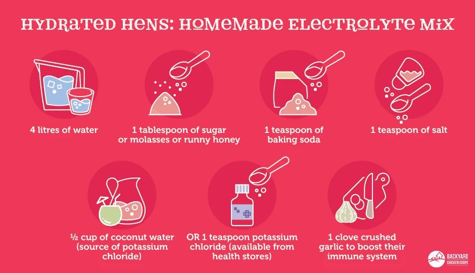 Chickens are better suited to dealing with colder temperatures than with hot ones, which can lead to heat stress and death. One of the most simple, but critical components of a good chicken first aid kit are electrolytes, which can be used to support your entire flock, or to treat an isolated bird in a sick bay. Electrolytes help the body cope with dehydration by replacing particular minerals required by cells and organs to function.