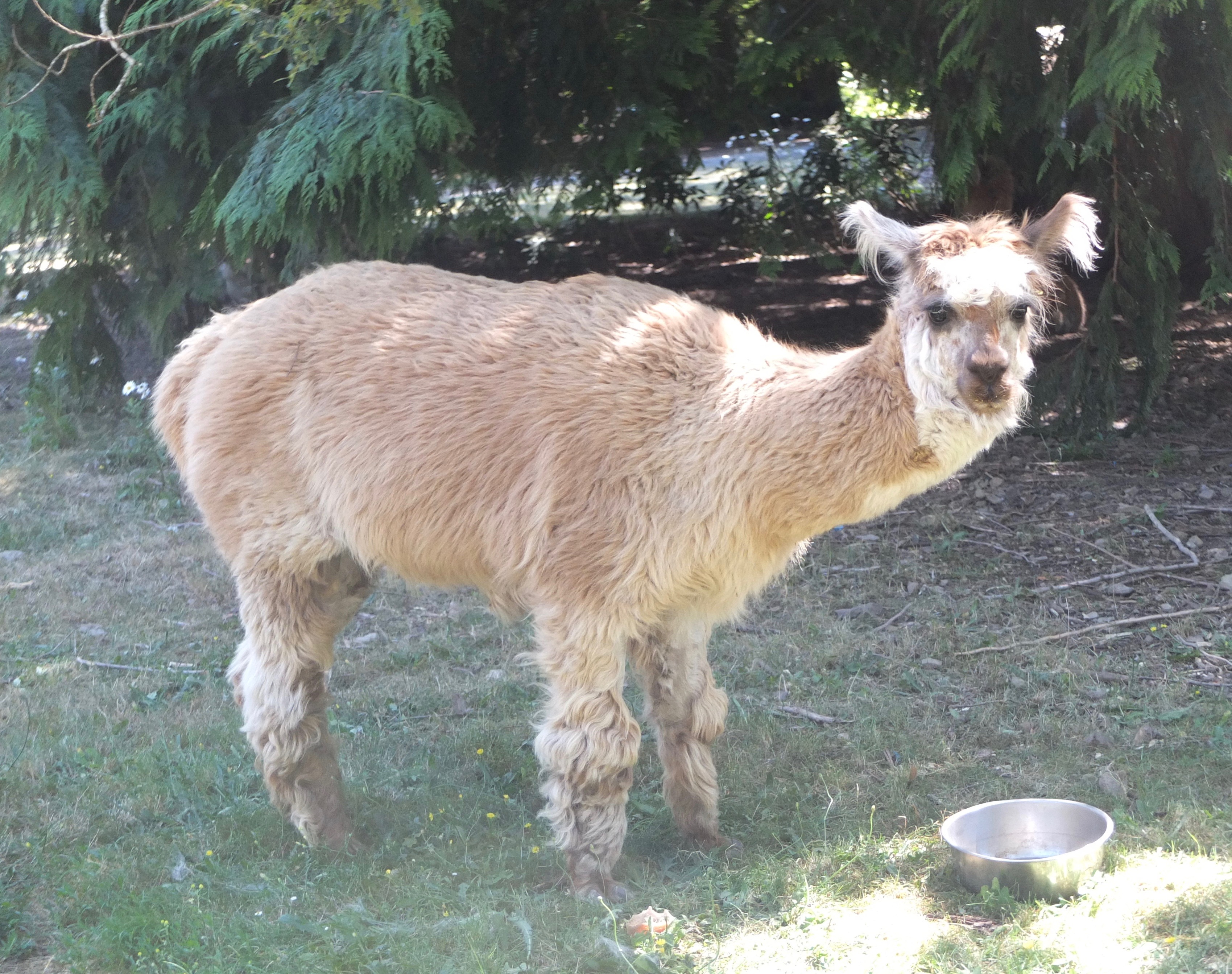 They’ve had issues with predators: mink, raccoons, dogs and eagles. Two alpacas were brought in as livestock guardians; they are great at chasing off unknown dogs, but fall short with everything else. That’s where their Norwegian Elkhound comes in. Between them, they’ve managed to curtail the poultry lost. I was amazed that the alpacas are totally free-ranged and, despite not being fenced, they rarely leave the property. After years of being well-loved they still don’t like being handled, but will tolerate some pets while being showered. They poop in the same spots so it’s easy to shovel and use as fertilizer for the garden.