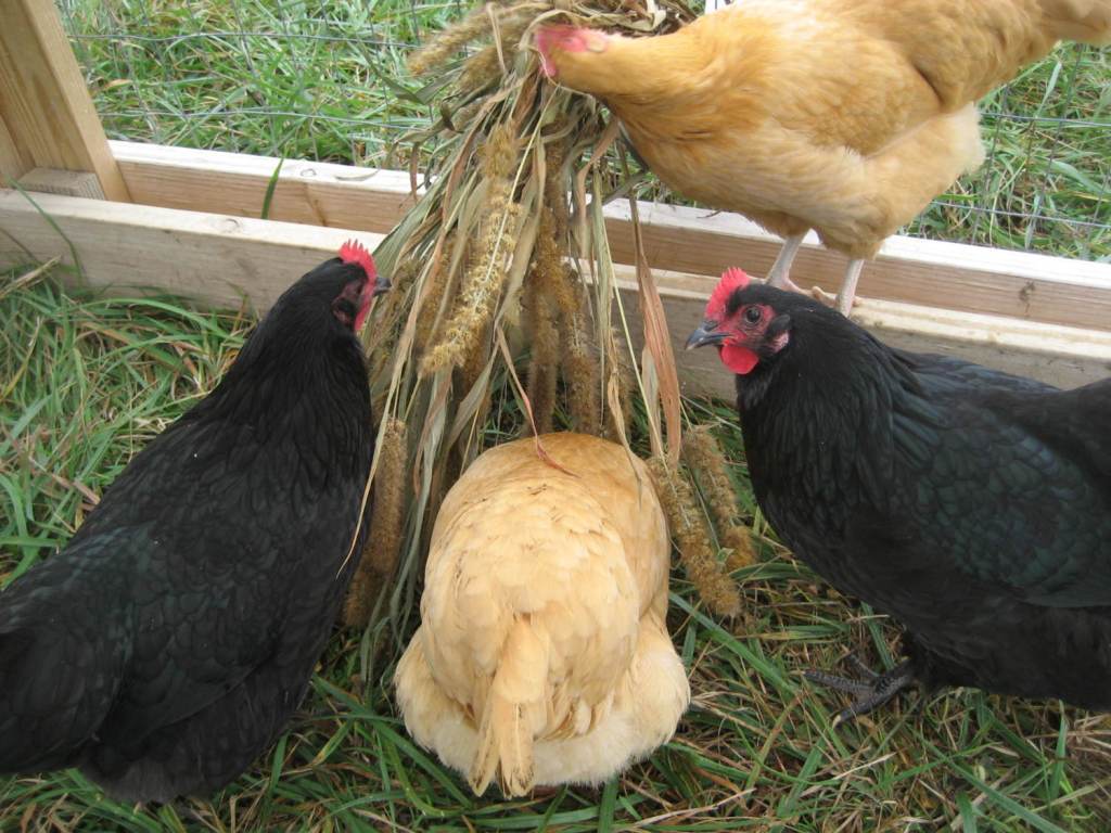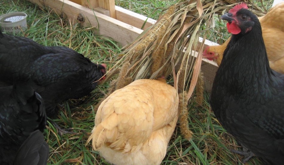 Some folks grow a small patch of grains – wheat, rye or barley – for their flock. It might be fun to plant some millets for a treat, either given raw or cooked, straight or added to chicken feed.