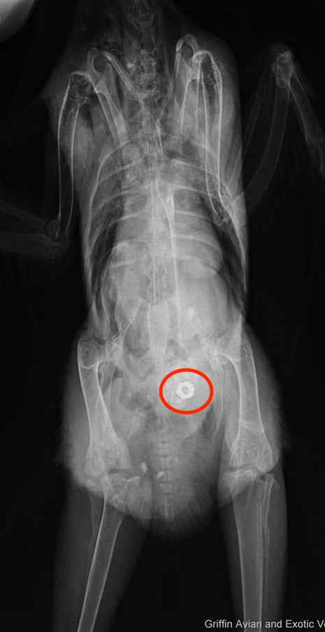 It’s obvious that some birds can live a long and healthy life without being adversely affected after having consumed foreign objects, however, the ingestion of metal objects can lead to poisoning. Once inside the digestive system metal begins to corrode and, if it contains zinc, can be absorbed into the bloodstream causing damage to, and rupture of, red blood cells. Sharp objects pose a risk of damaging internal tissues and organs.