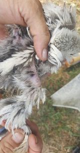Dr Bowes: This bird has a congenital deformity of the pelvic girdle. The pelvis is splayed so the chick can’t stand properly. The protrusions on either side of its back are actually it’s knees.