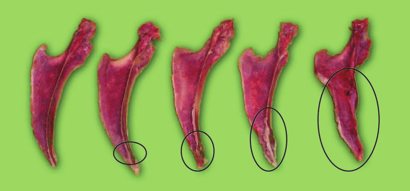 - Keel Bone Fractures: The growth of a laying hen’s skeletal frame ceases around sexual maturity (approximately 18 weeks of age), but the bone formation process of the keel (breast bone) continues for another five months. When young hens begin producing eggs, the tip of the keel is made of cartilage and not bone. In high-producing layers their keel bone receives inadequate calcium for proper bone growth during the early laying period. A study from the University of Copenhagen revealed that the majority of commercial Danish layers suffer from keel bone fractures, which are the result of disproportionately large eggs that put internal stress on a hen’s skeletal system.