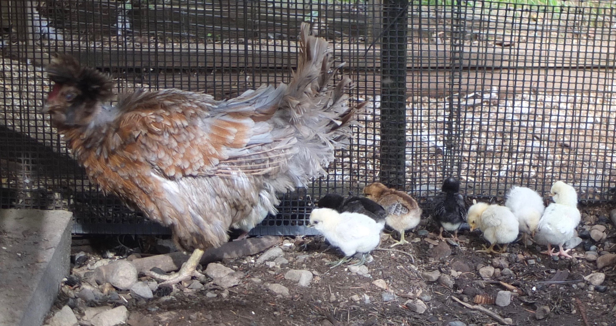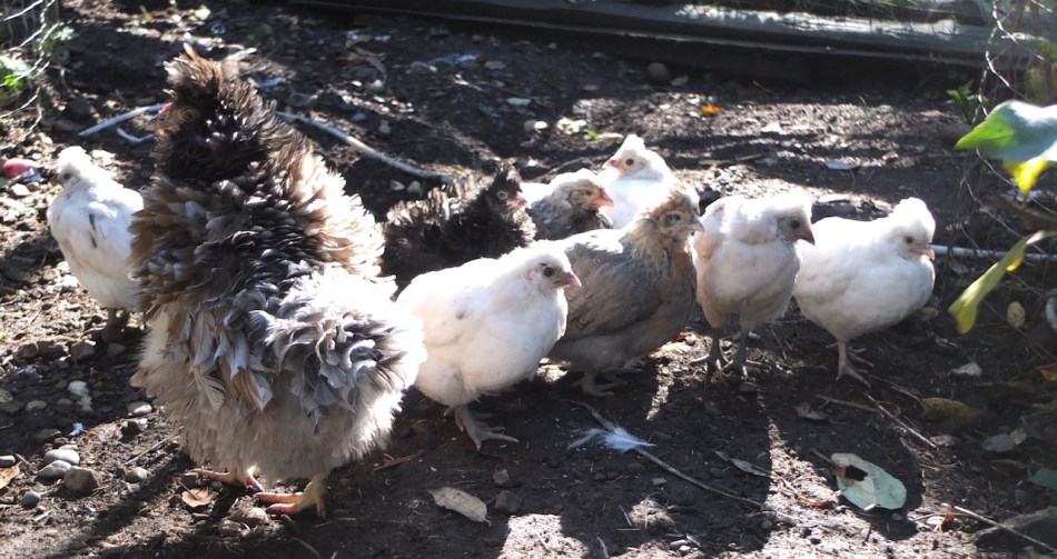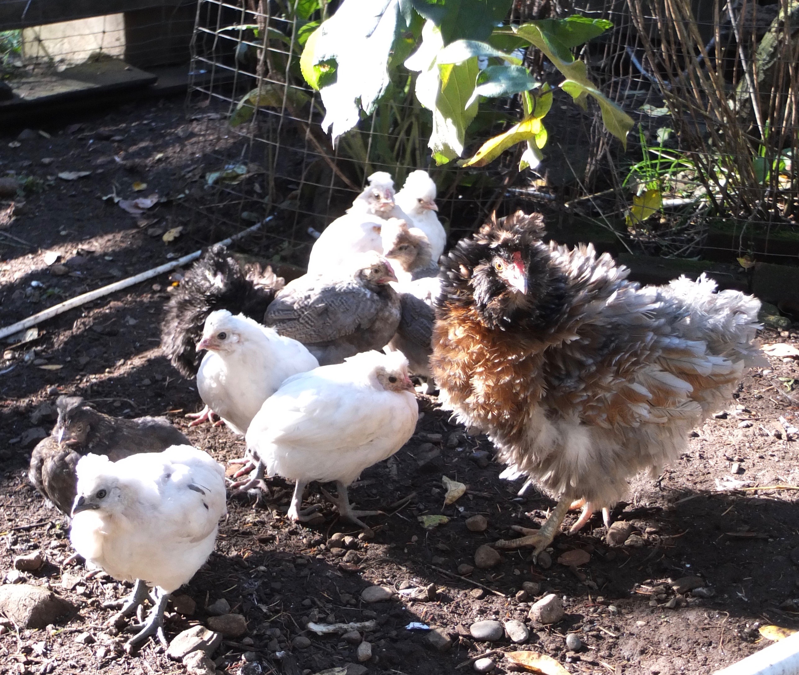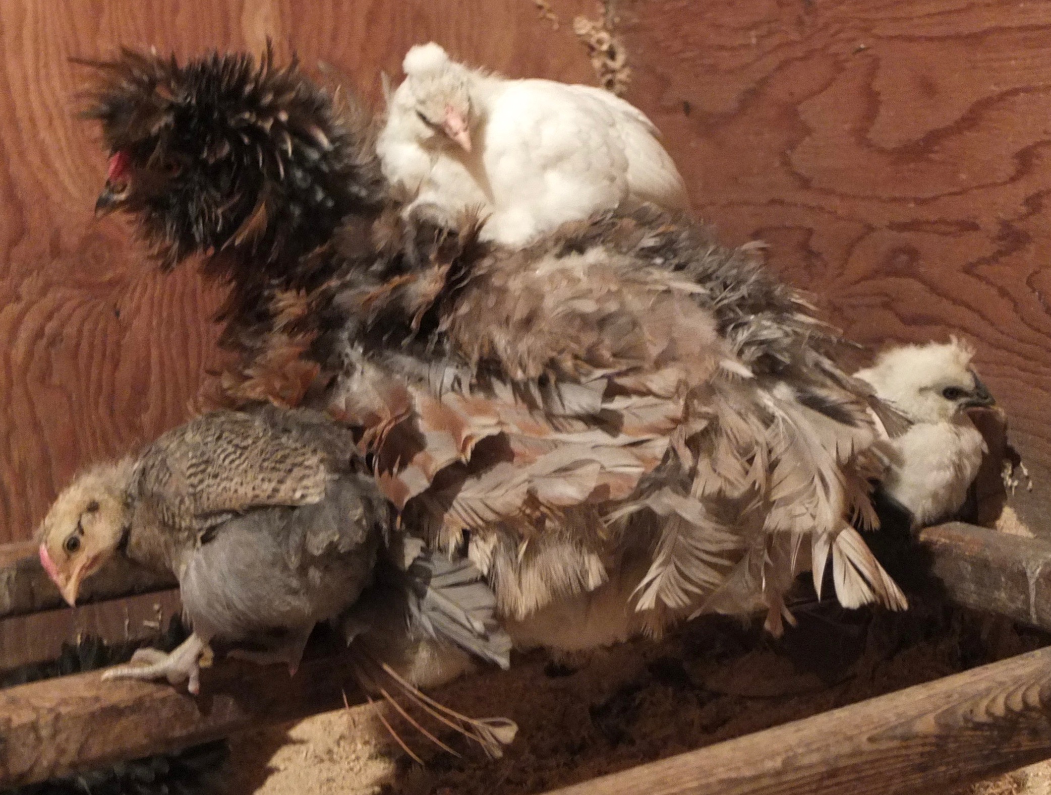 At the very moment nine weeks ago, when that little pullet was killed, Coco was hatching out her first chicks. At almost 3½ years old this was her first shot at motherhood. Despite my concerns about her inexperience and the time of year she’s been a trooper. I couldn’t have asked for a better mother. I took some photos of her little brood a couple of weeks ago and thought about it today. My camera was in the house so I put it on the to-do list for tomorrow.