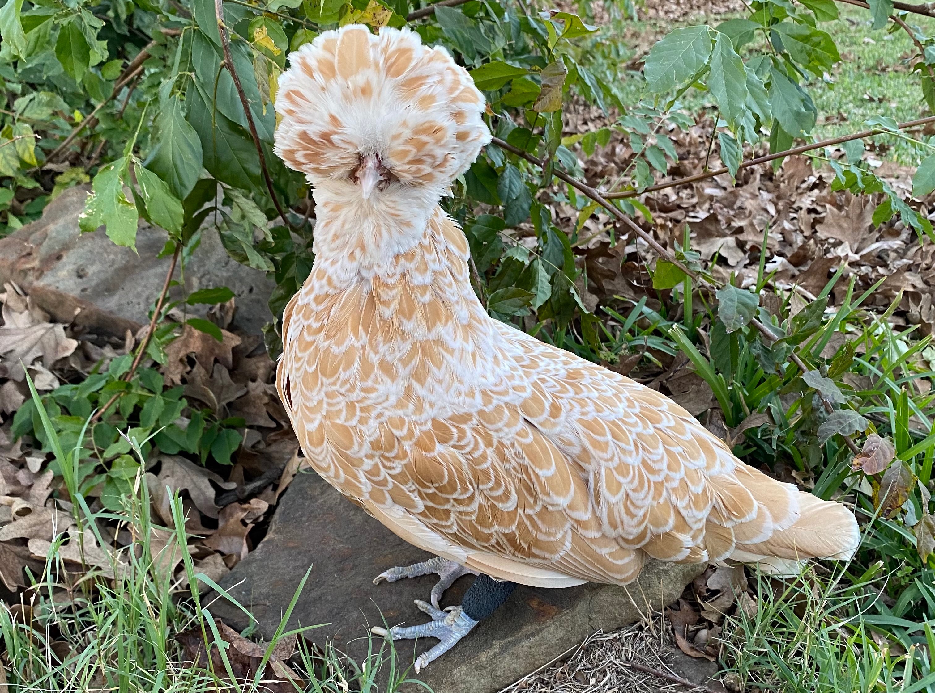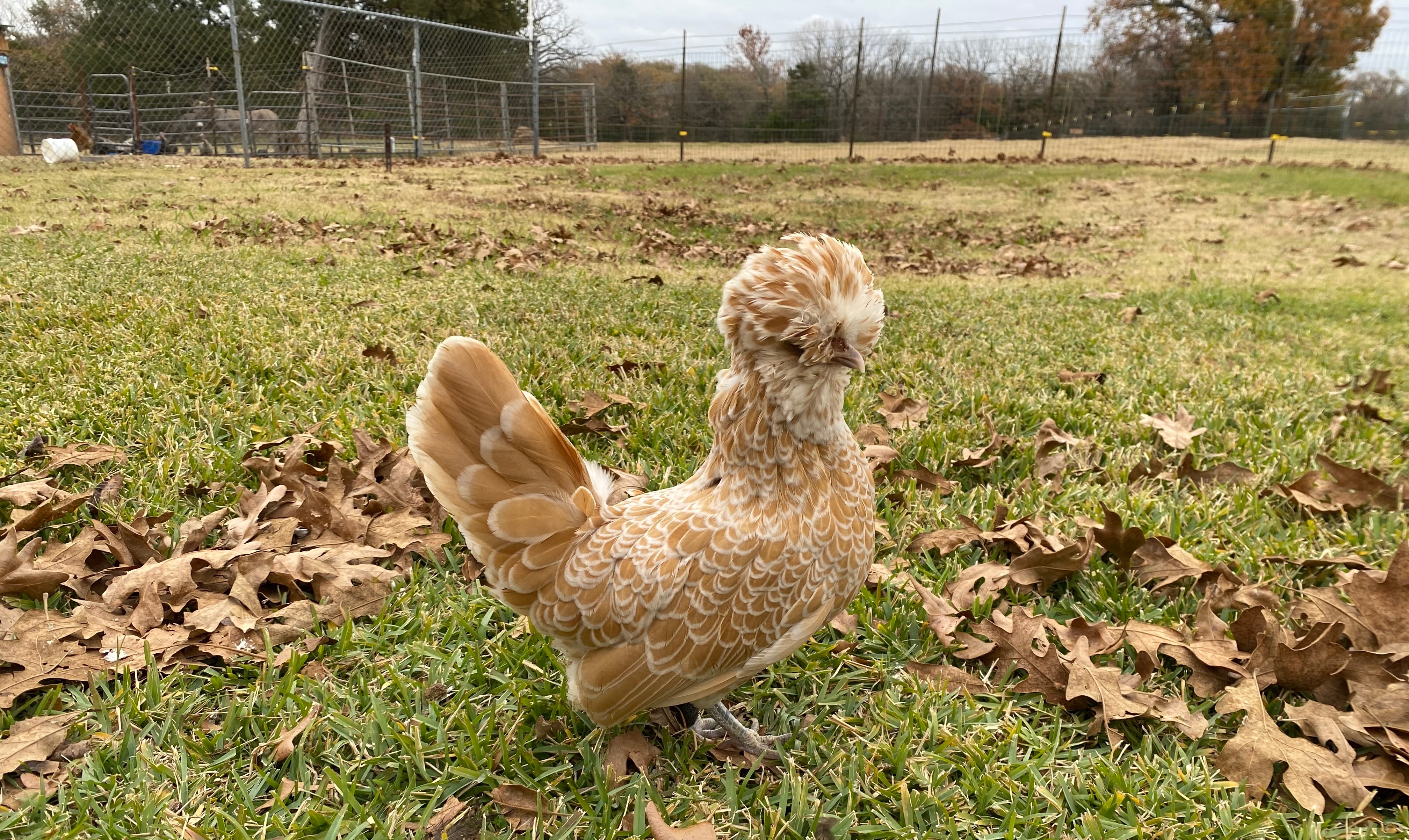I have standard sized buff laced Polish chickens and was approached by a breeder at an APA poultry show in Arkansas. I told him I wasn’t interested in buying bantams for myself, but would come look at them because I know breeders who would be and I could bring them back to Texas. That’s when I saw the band embedded in Latte’s leg which caused her to limp and impaired her ability to stand properly for any length of time.