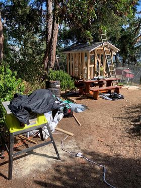 A few weeks later I met up with Megan and her partner David to offer some chicken keeping advice. They had purchased a prefab coop and once it was assembled wondered if the size was adequate. I didn’t want to be a downer, but suggested they keep it for future use for a broody hen and chicks, as a quarantine pen or infirmary and build their own from scratch. There was a 4’ x 8’ raised platform where they wanted to locate the coop as well as a nearby framed building that was split into a workshop and a woodshed. I suggested that they either convert part of the shed or build on top of the platform.