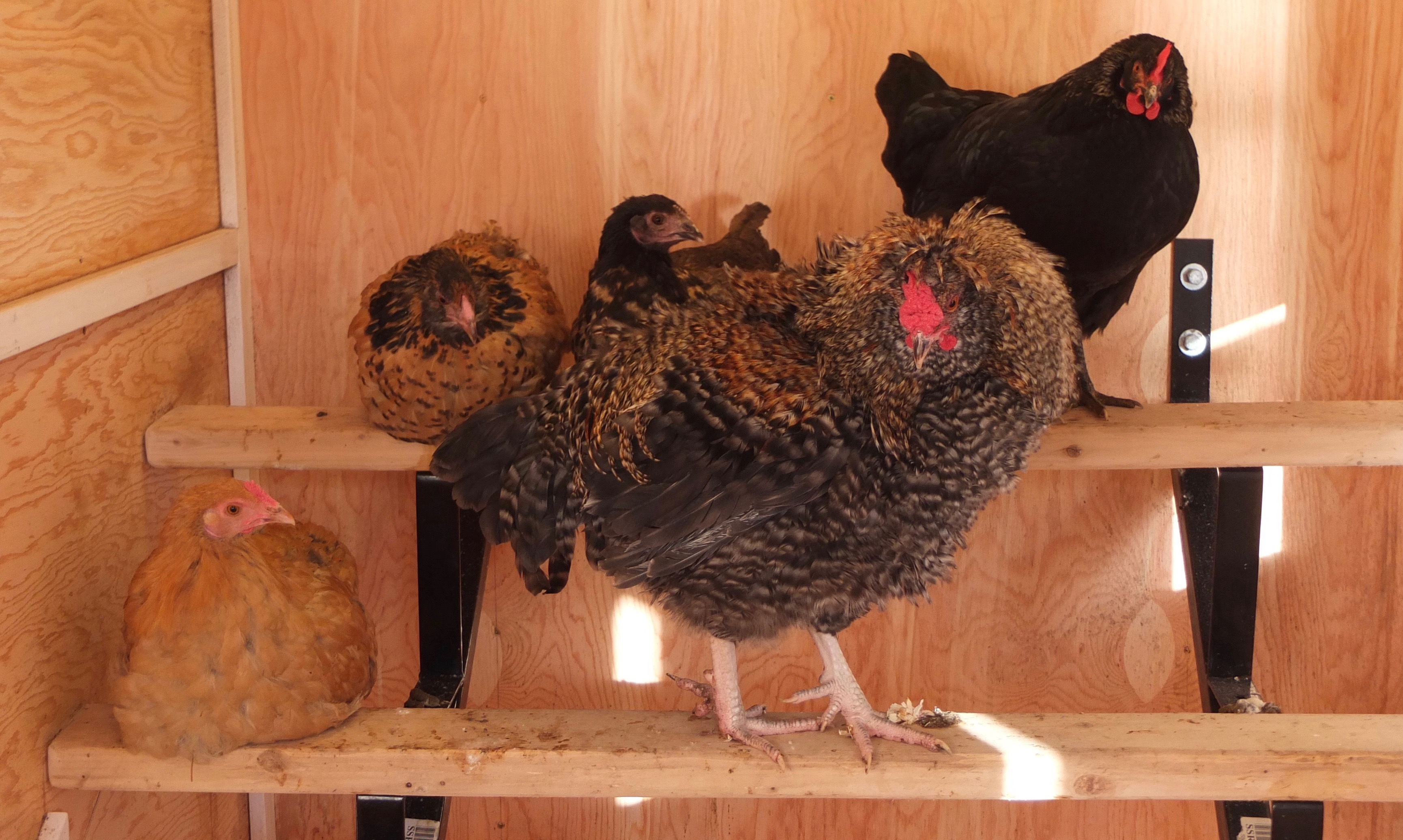 I asked the folks who had dibs on the frizzle if they were open to taking his smooth feathered brother instead and luckily it was no problem. When Megan and David came to pick him up they had a bottle of rum in hand, having learned that I enjoyed Mojitos from reading my post on mint. They named the new addition Albert, which was promptly changed the next day by his 4 year old grandson to Magical for All (Magic for short). The two birds bonded quickly. Rounding out the flock are three more pullets given to them by my friends, Thomas and Elizabeth. The girls have been named Wanda, Goose and Borislava.