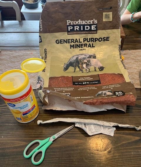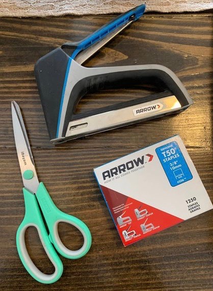 Step 1: Gather supplies: Feed bags, staple gun, staples, scissors, wet wipes or a cloth and soap and water.