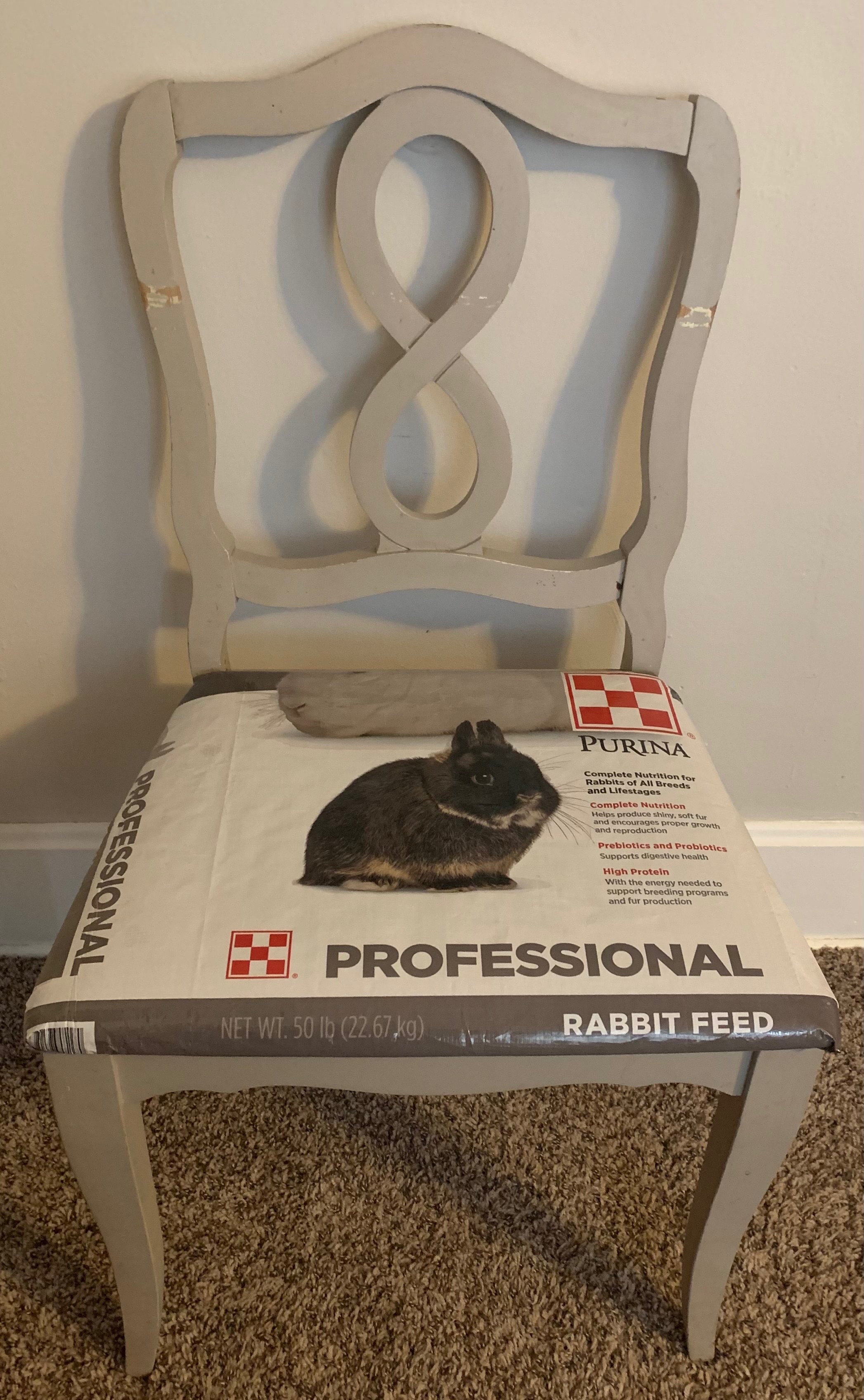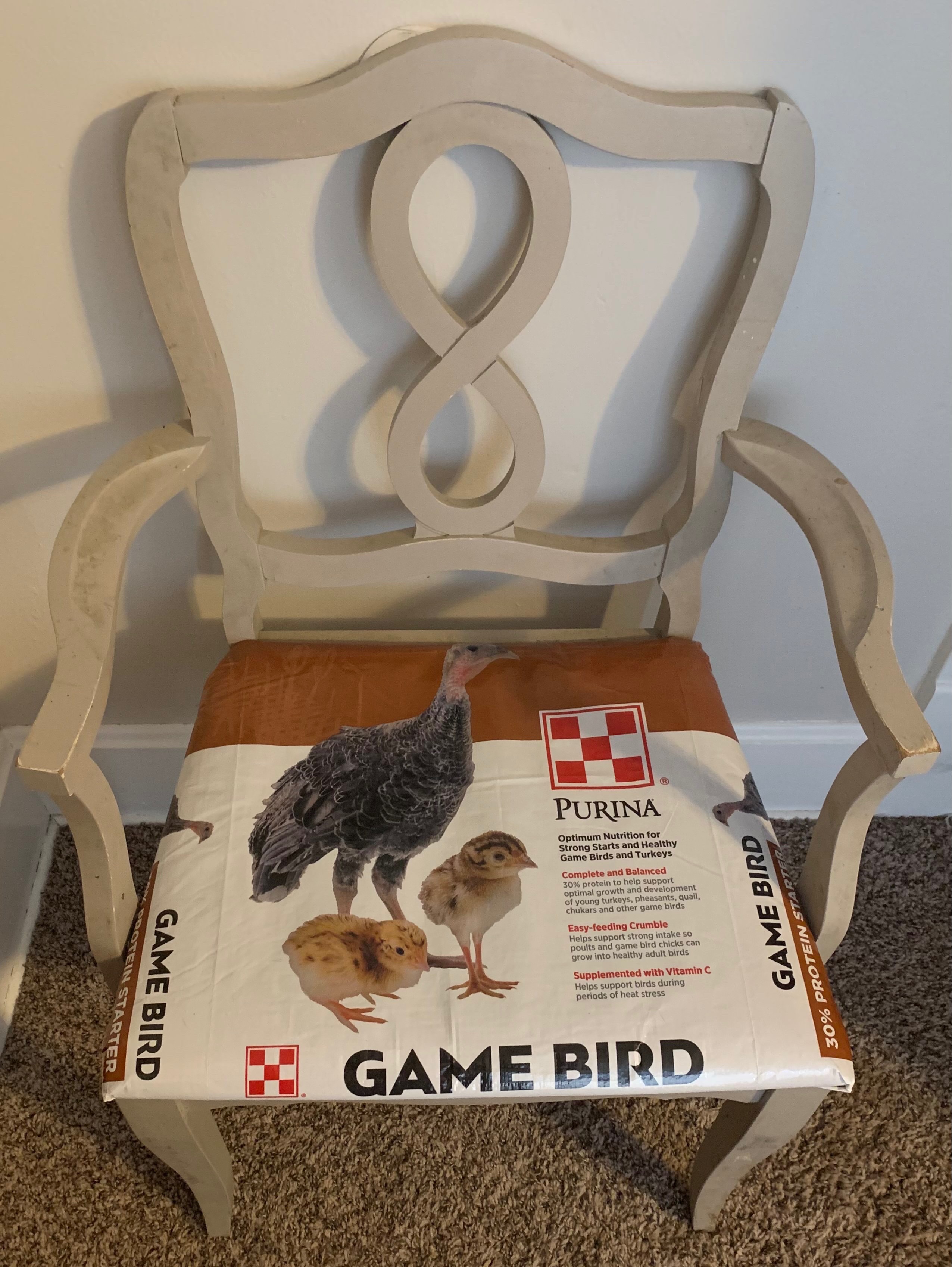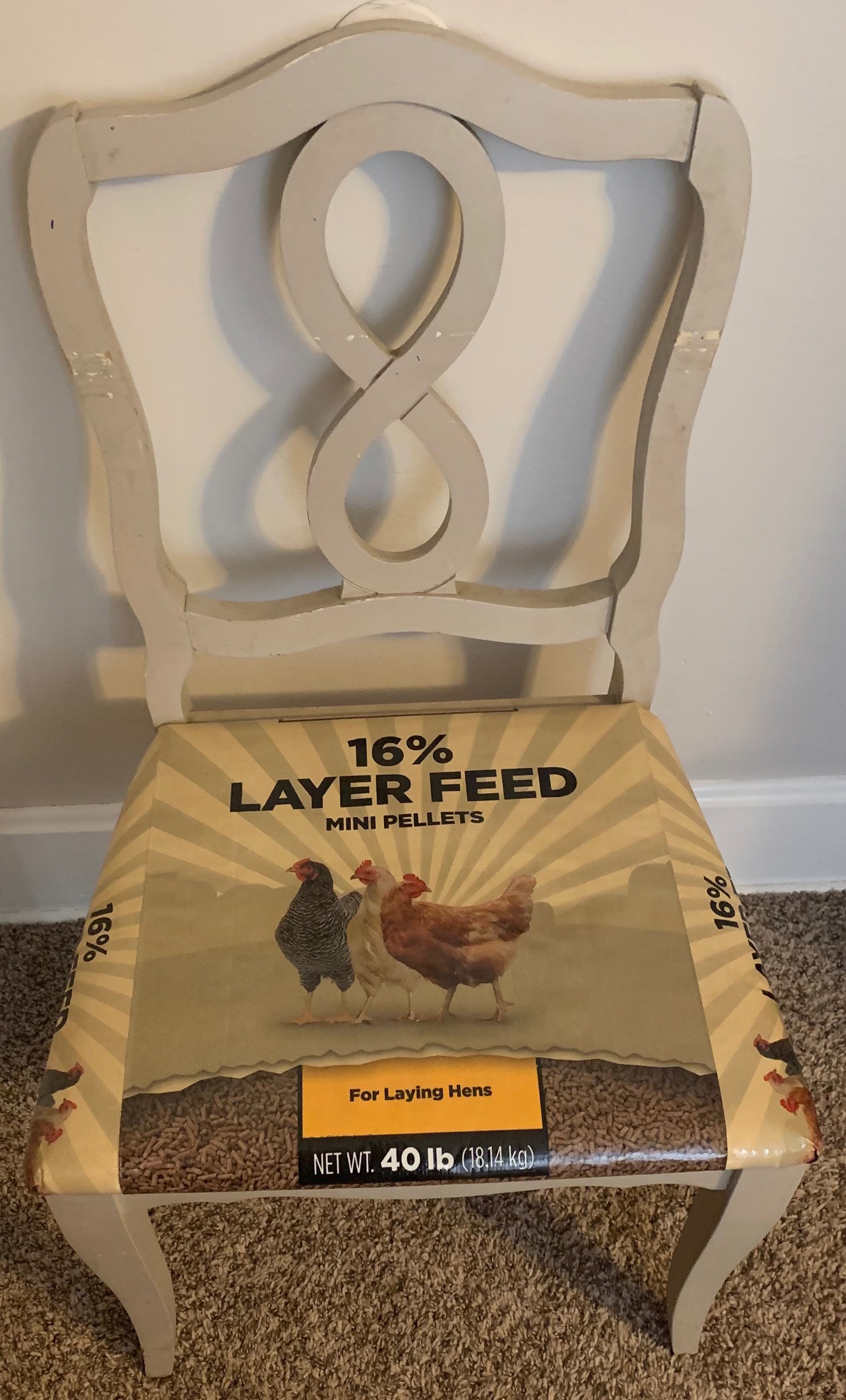 My next project was to reupholster our dining room chairs with the feed bags, which are durable, thick material and water resistant, making them nearly child proof and easy to wipe clean after meals and crafts.