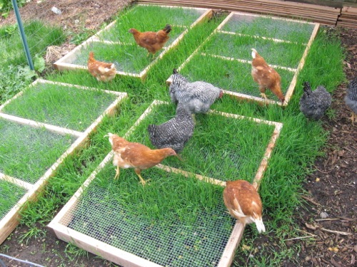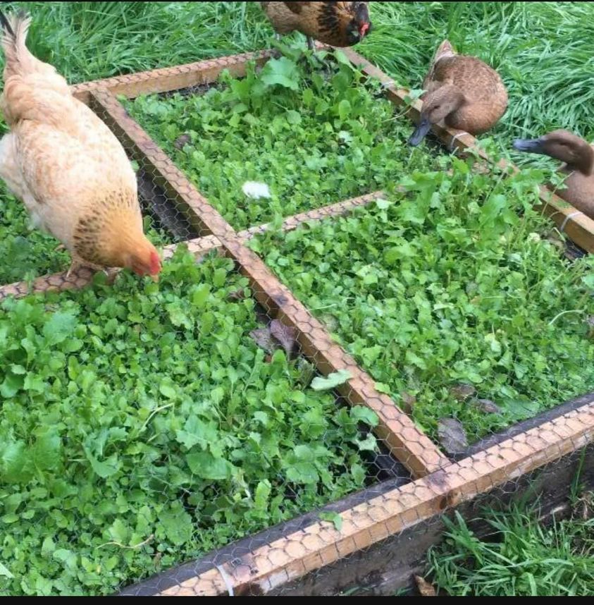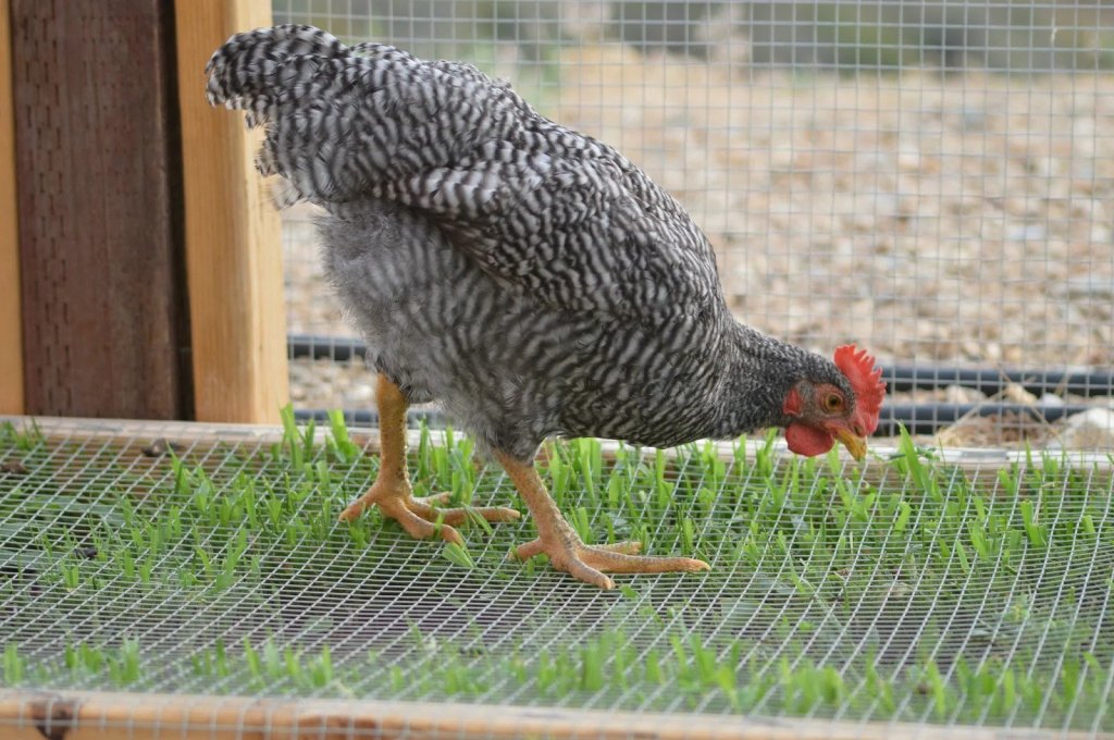 One way to provide fresh greens to your birds is to allow them access to your garden at the end of the season for short periods of time to eat bugs and rototill the soil. If that’s not an option you can build simple raised beds, cover the top with wire and plant them with cover crops, grasses or grains and let you birds nibble off the tops.
