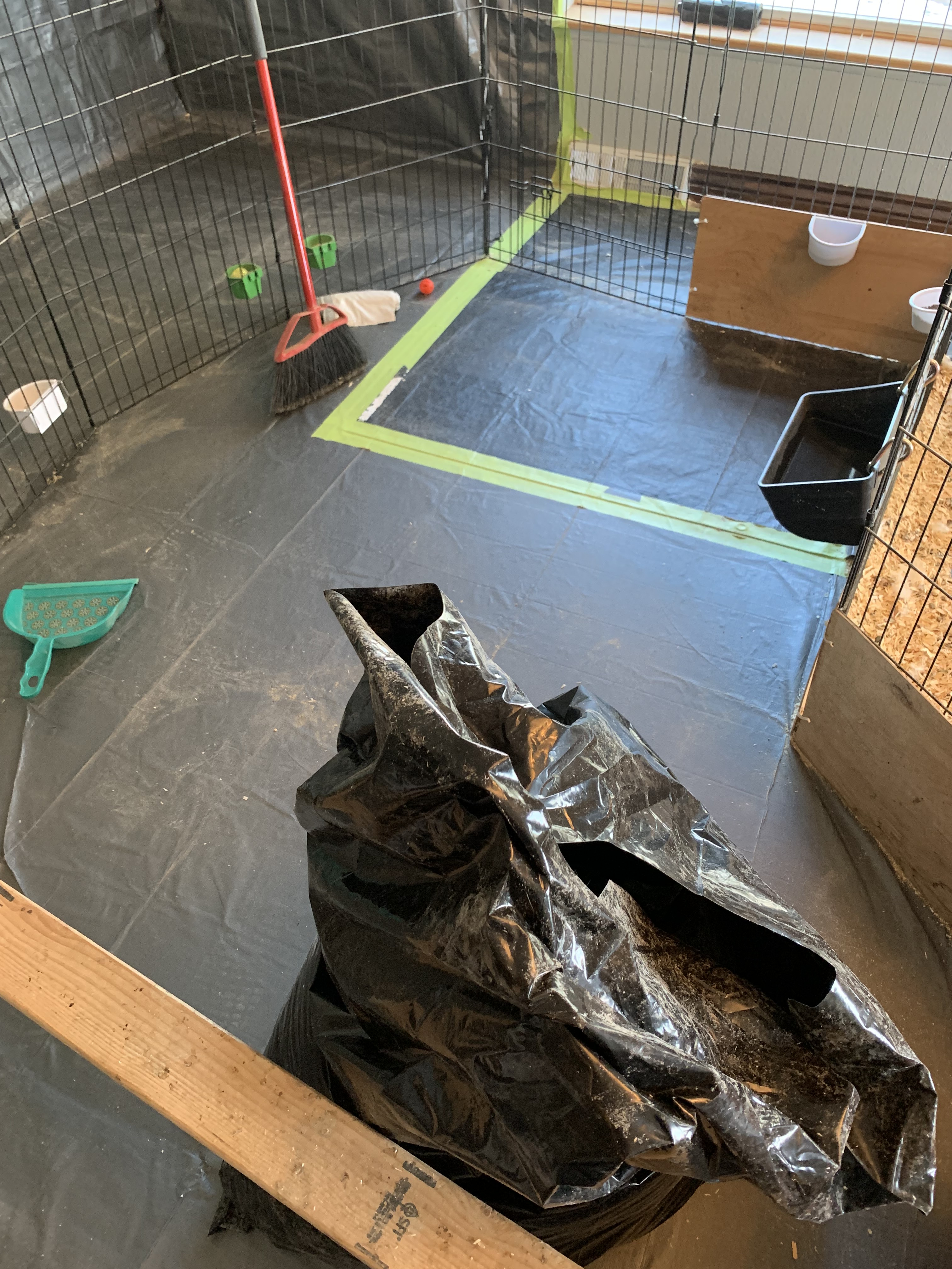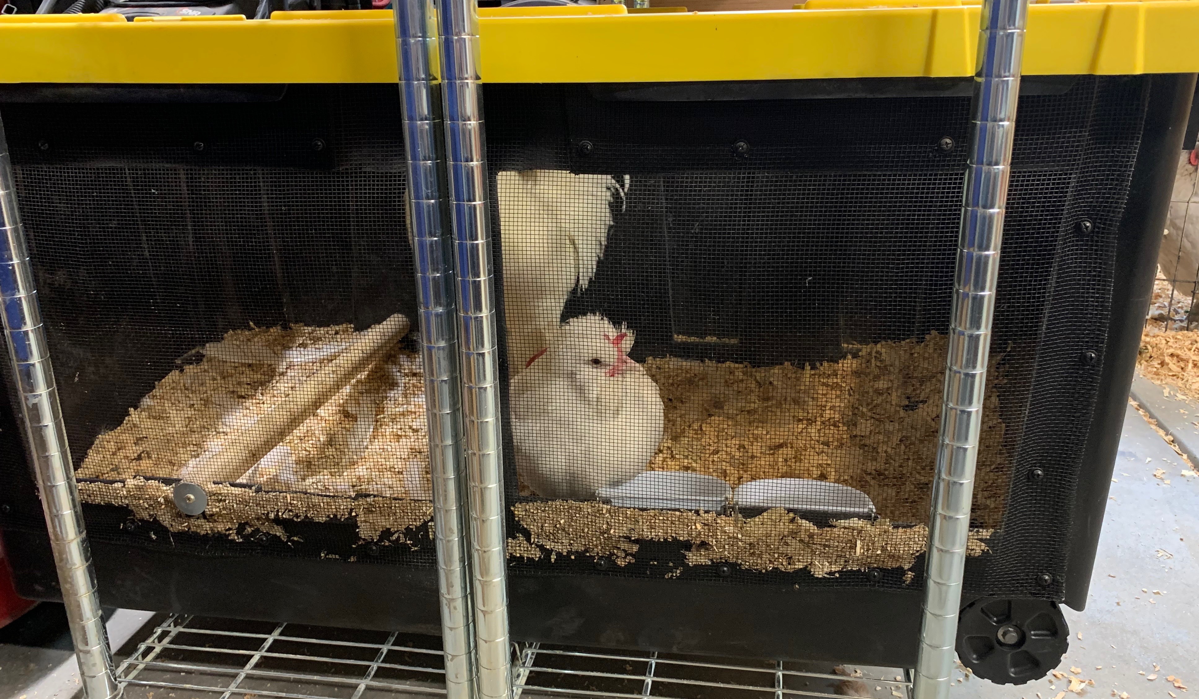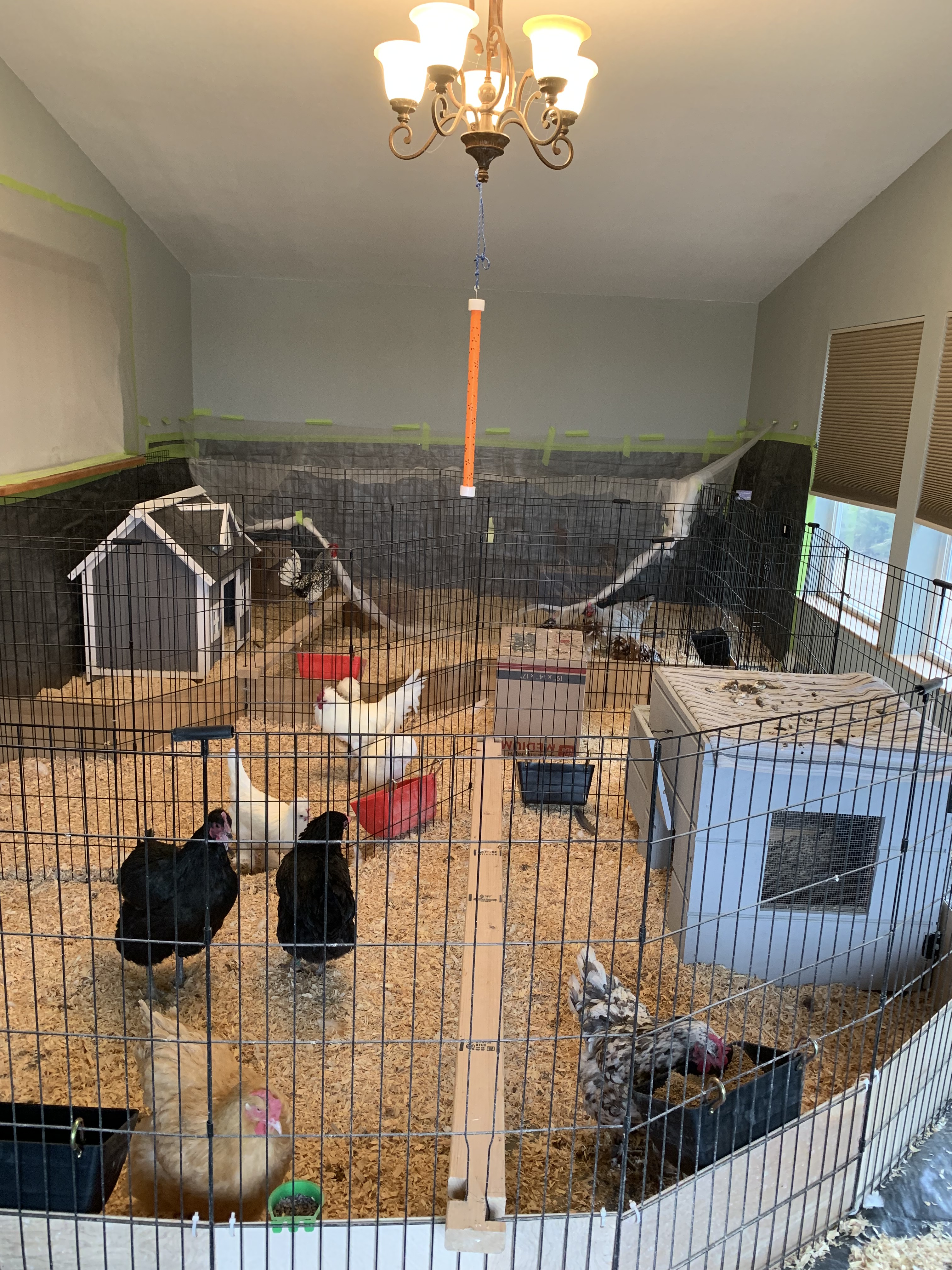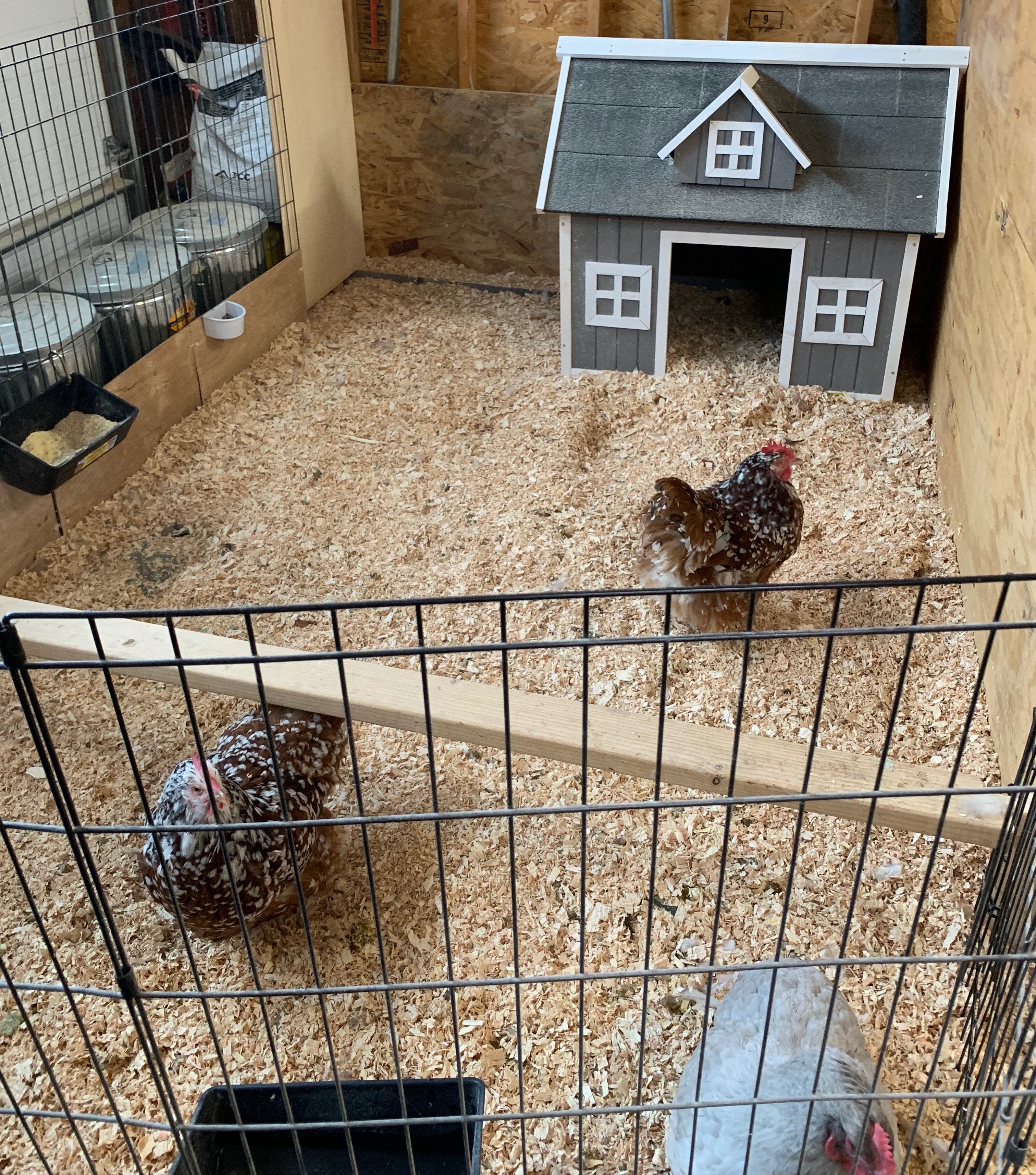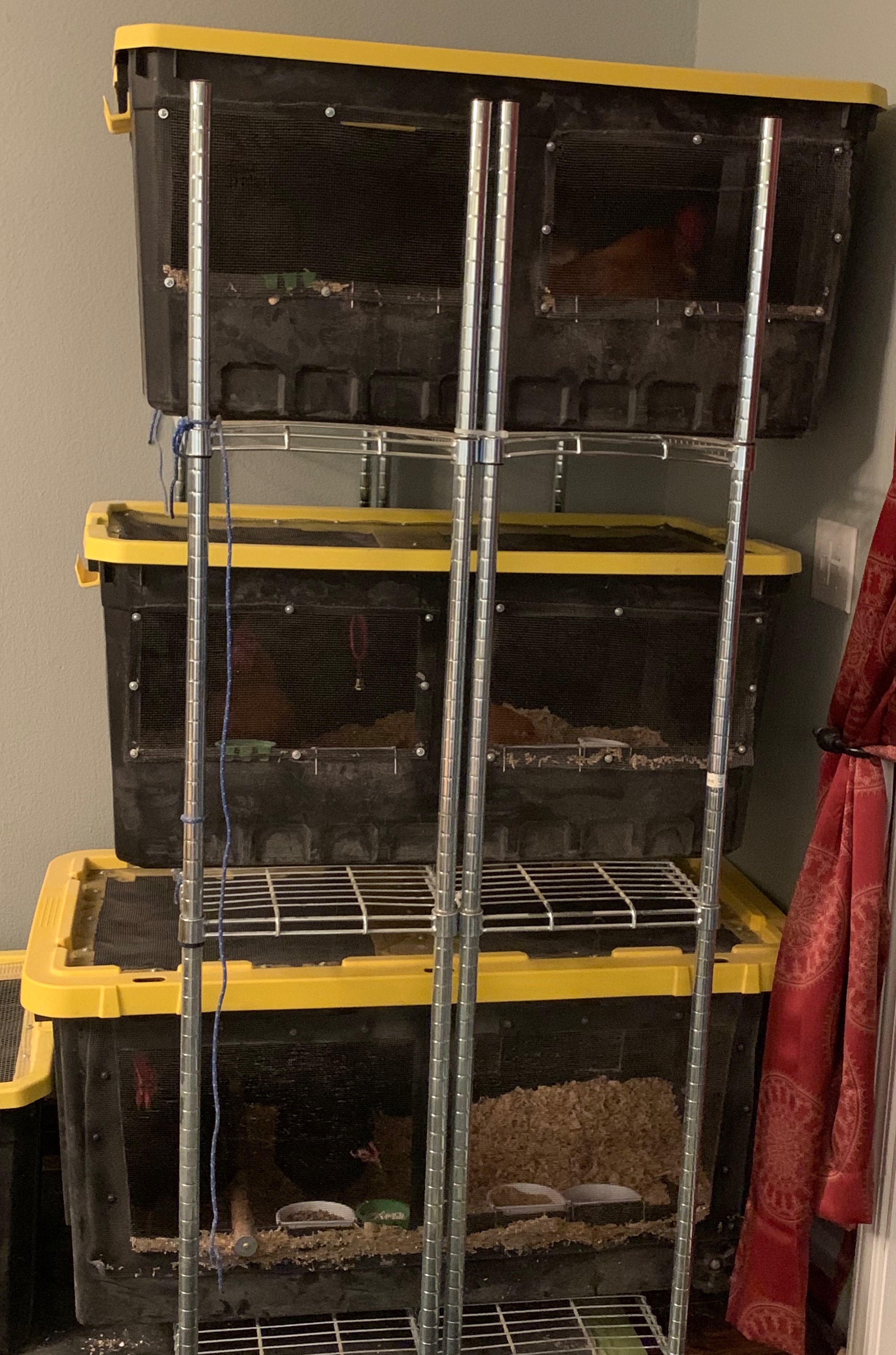 In the meantime, we have converted our great room into an indoor aviary (I never understood why anyone needed two living rooms anyway). The entire room is protected by a 30’ x 30’ tarp that covers the floor and goes up the walls about 4’. We used dog kennel panels to create four separate runs with roosting areas and nesting places. I have a shelving unit where three 55-60 gallon Rubbermaid containers house my bantam breeding pairs. I use fine pine flake shavings as the substrate in the pens and boxes and change out bedding once every other week in the boxes and once per month in the runs. I spot clean in between bedding changes.