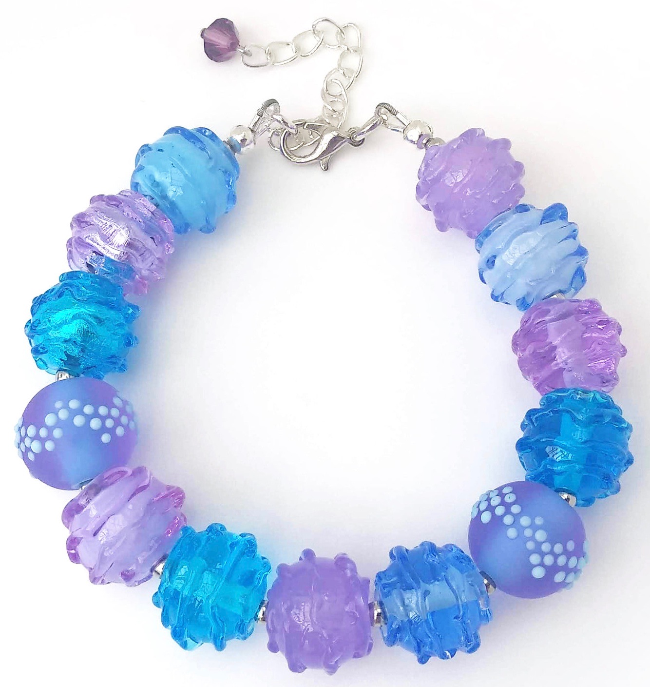 A few years back, I took on a new hobby: lampworking, and once I discovered glass, that was it. I am all about glass now; I am mesmerized by the way it breaks the light, its transparency, the way it flows when it is liquid and its colors and reactions.