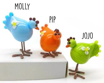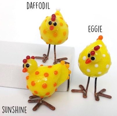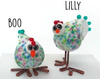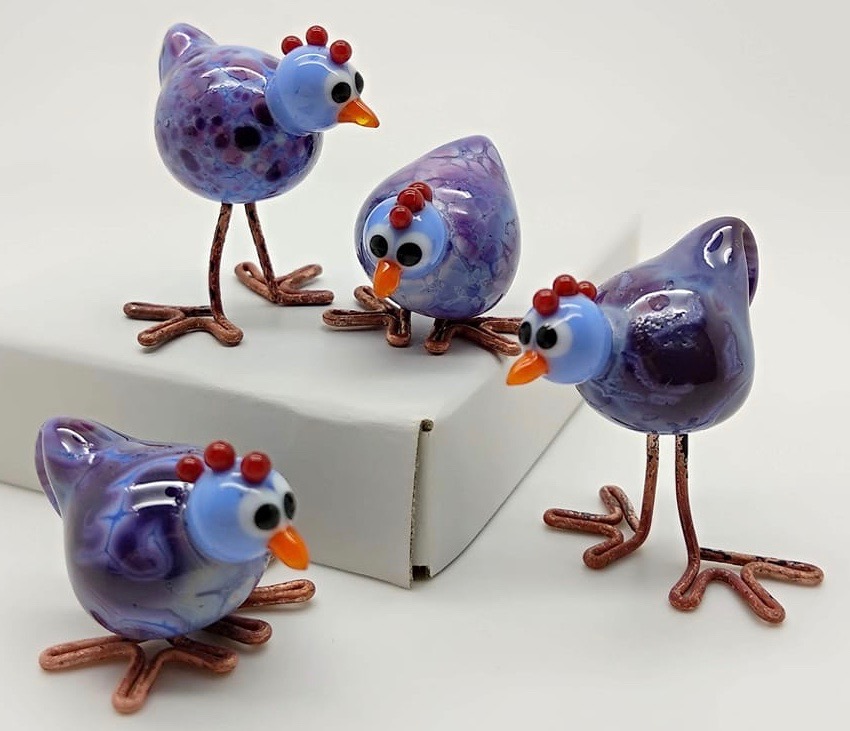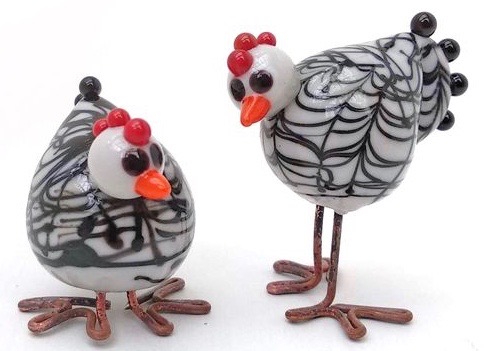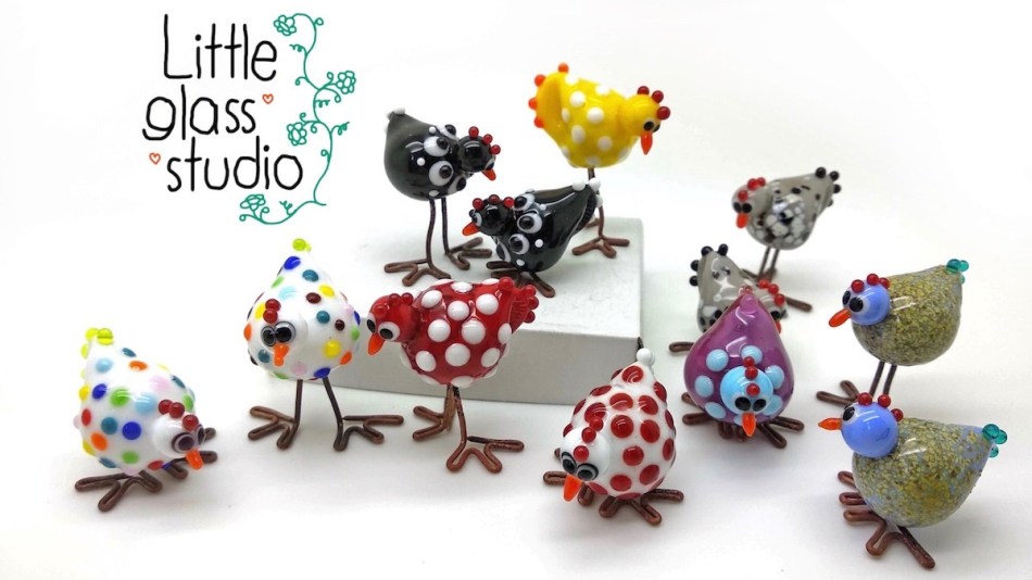 When I took on lampworking it wasn’t long before I made a chicken from glass, with little copper toes. A friend asked me to make some for her to gift her sister, and that was the start, I have made many chickens since then.