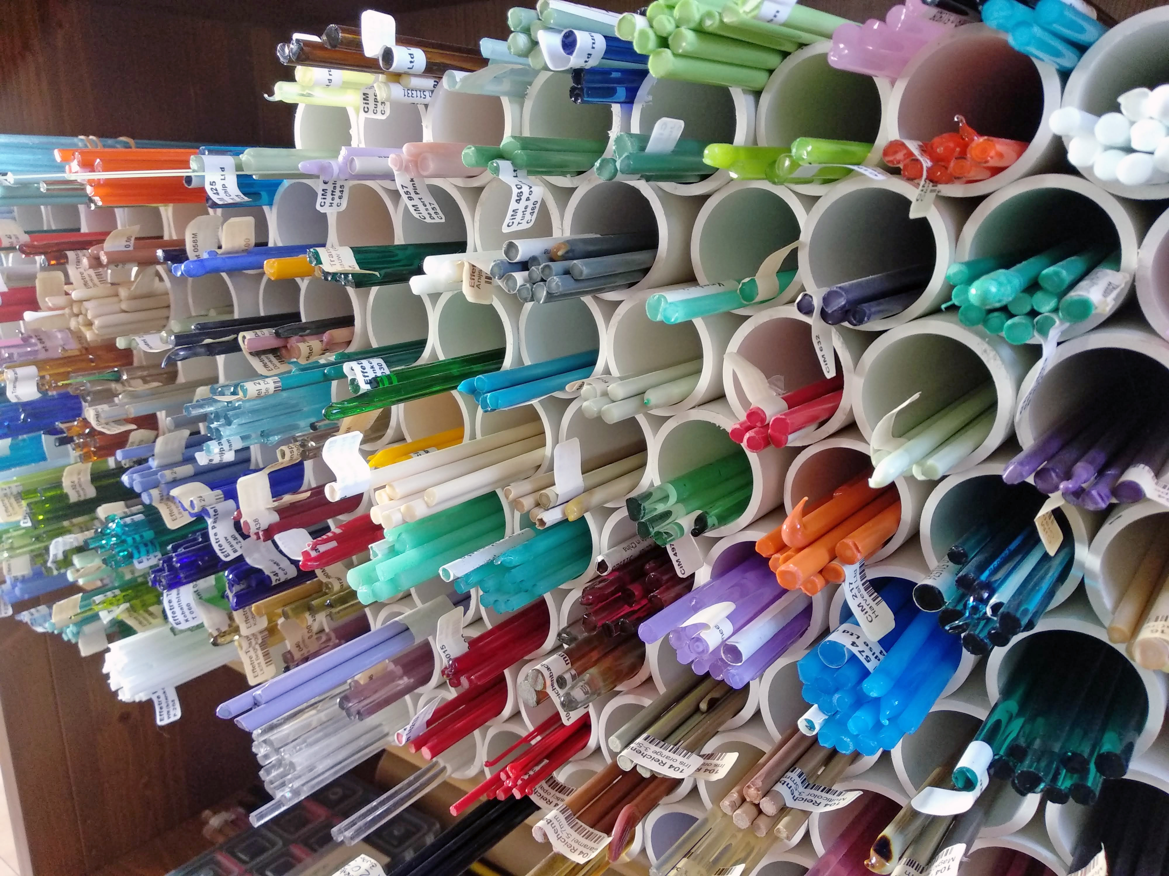 Glass is available in many colours and from many manufacturers. I use soft soda lime glass, mostly Italian glass that’s made on the isle of Murano, near Venice; also an American glass with the most amazing colours as well as some from Germany and Czechoslovakia. I have to confess, I have a small addiction to collecting colours.