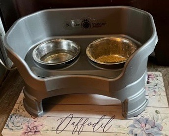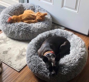 When I clean the house I will move her crate and vacuum that area too. Her room has a baby gate with a small door cut into it where she can walk through and access her food and crate if she wants. Our dogs will help themselves to her food if given the chance. We also use a Neater Feeder for her food and water to corral her food mess, which requires cleaning every other day. Dil has some toys that she has claimed too: a plush dog toy she will rub her feet on and snuggle, a circular cat ball spinner (we had to buy one for travel as our cats still use the toy too) and an interactive ball that dispenses treats if she kicks it around.