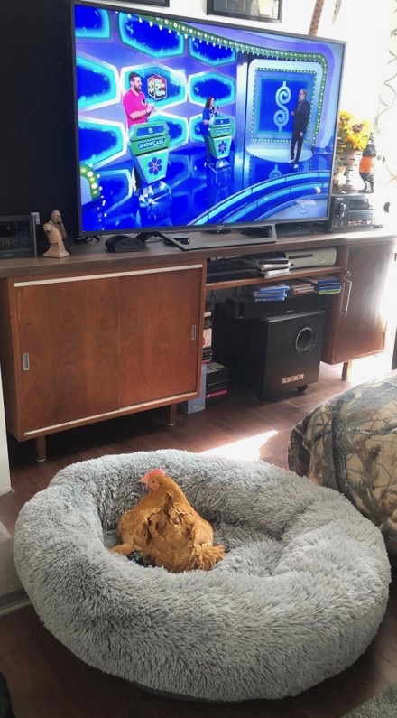 During the day she has free range of the house and at night she has a crate in my office/guest room with a soft bed in it for sleeping as she also has arthritis. During fall and winter she is strictly indoors. On nice sunny spring and summer days when it’s not too cold or hot she does get free range with her sisters. I only do supervised free range with my hens, which means I spend hours outside with them, weather permitting.
