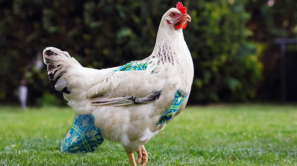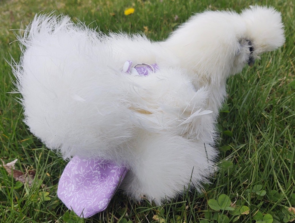 The last time I wrestled with my mum’s sewing machine, 40 years ago, I ran over my fingernail with the needle. Not surprisingly, I haven’t attempted to make anything since and luckily, with the advent of the internet and budding entrepreneurs, I don’t have to. A quick Google search will reveal that chicken diapers are a ‘thing’. There are all kinds of sites with DIY patterns for those of you who are proficient seamstresses or, if not, many online stores that sell a variety of chicken apparel: diapers, aprons, saddles, leashes, tutus and more.
