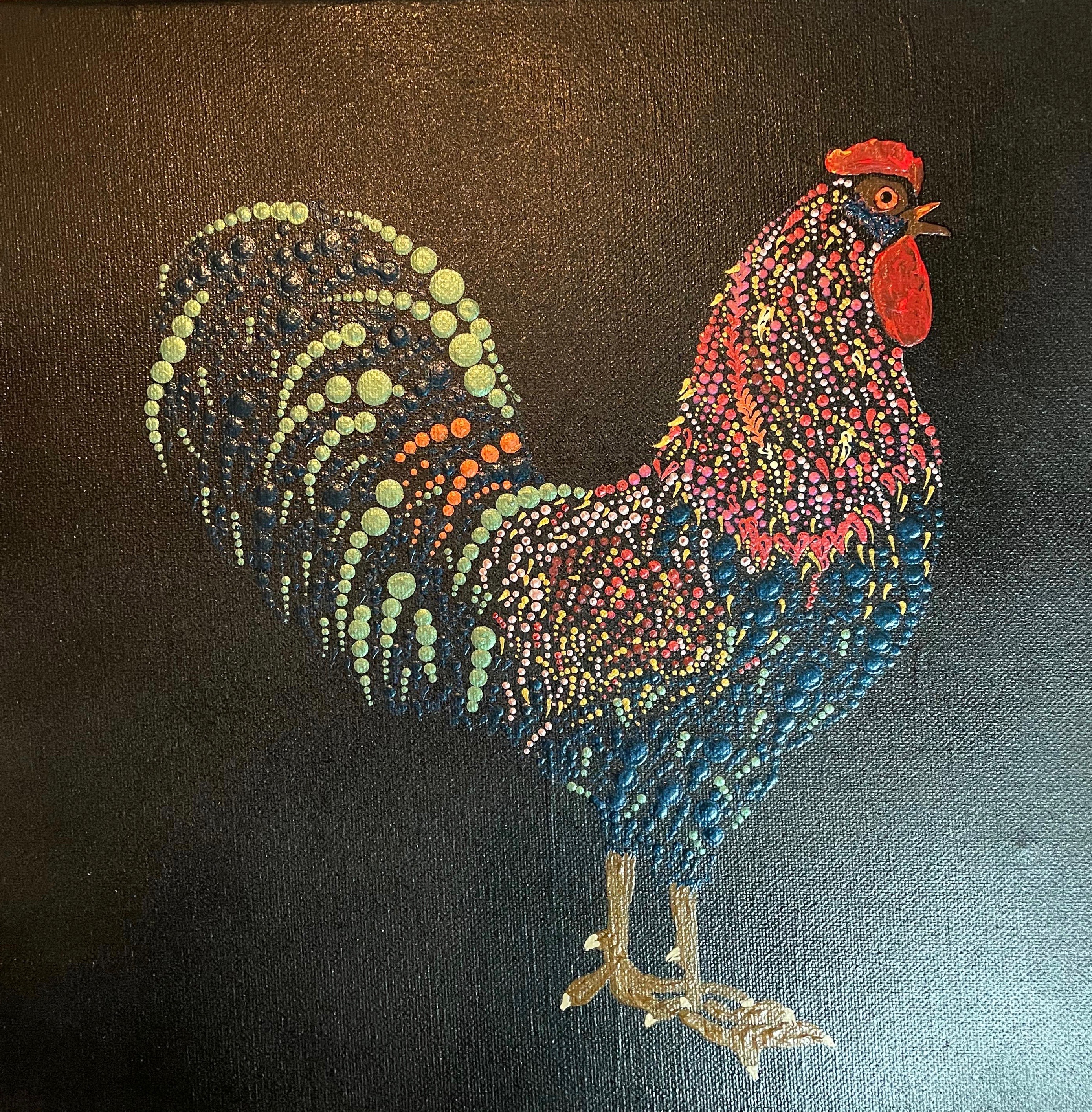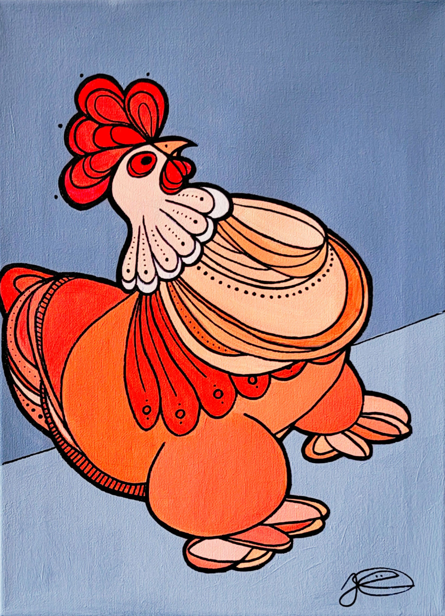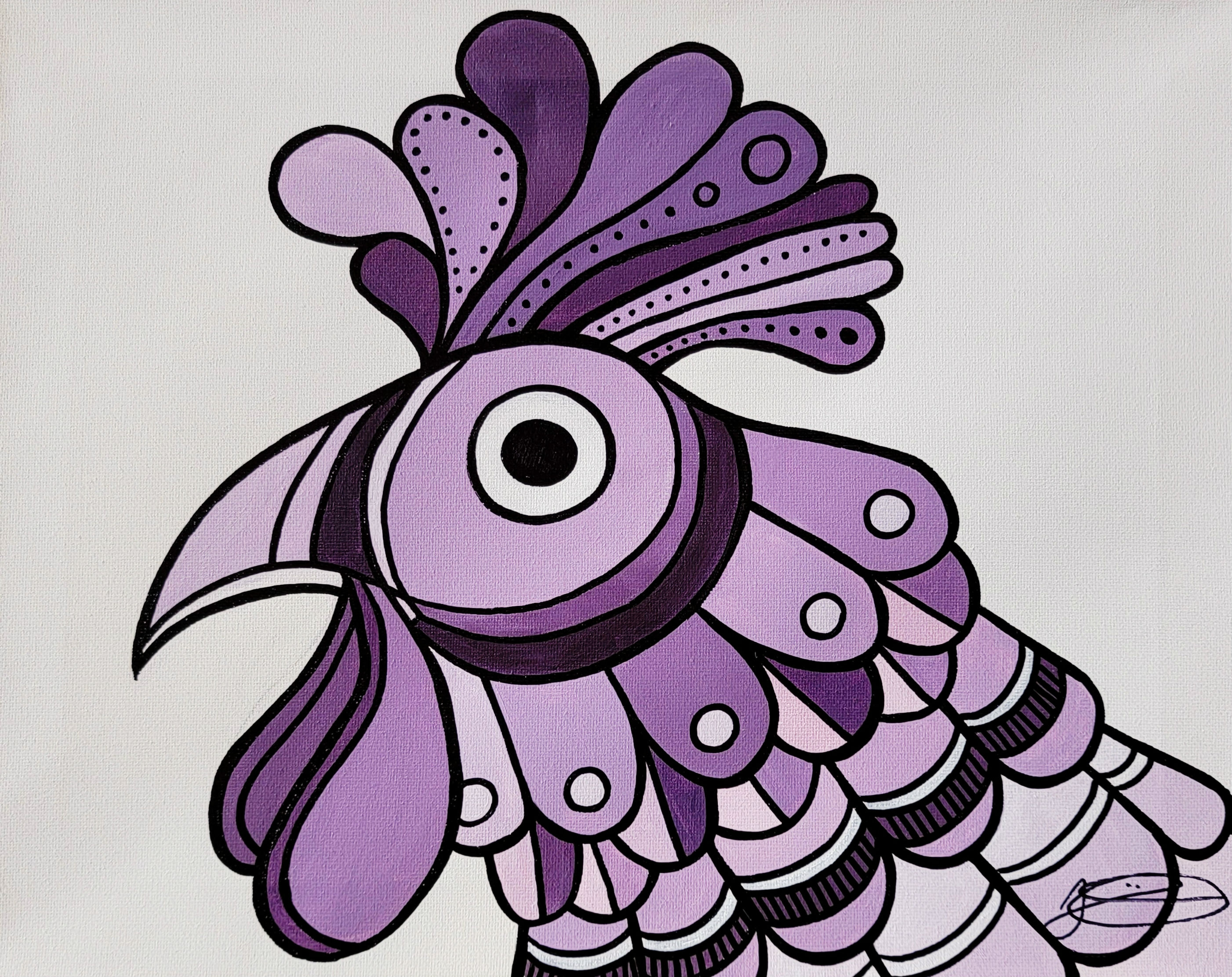Birds have always fascinated me and when I would free-draw, the shapes would always find a way to become feathers and beaks. A series of “Spirit Birds” transitioned into my new collection of “Doodle Chickens” that I am still working on to complete a full dozen. Spending time at my close friends’ homestead, I was kept company by their diverse flock of Brahmas, Silkies, Lavender Orpingtons and tiny bantams. I aspire to have a homestead and art studio of my own with a rainbow flock as colorful as my paintings.