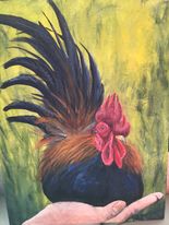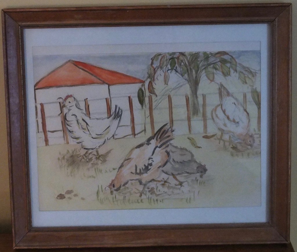 I painted the first two pictures years ago, as an adult remembering my childhood chickens. My dad came home one day and said we are moving to a farm, which was every kid’s dream. We got bantam chickens: Henry was shy and didn’t want to be handled, but Henrietta loved it when we visited her and nestled contentedly into our hands. One day my dad decided to “get rid of our little chickens.” We were quite distraught and begged him not to kill Henrietta! My father promised they wouldn’t. When we got home the next day there were dead chickens hanging upside down from the clothesline. My dad said don’t be upset we didn’t kill Henrietta. We ran to the barn only to find Henry walking around quite upset.