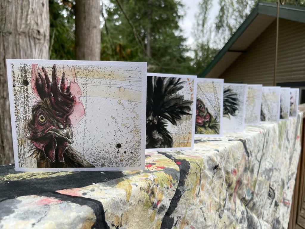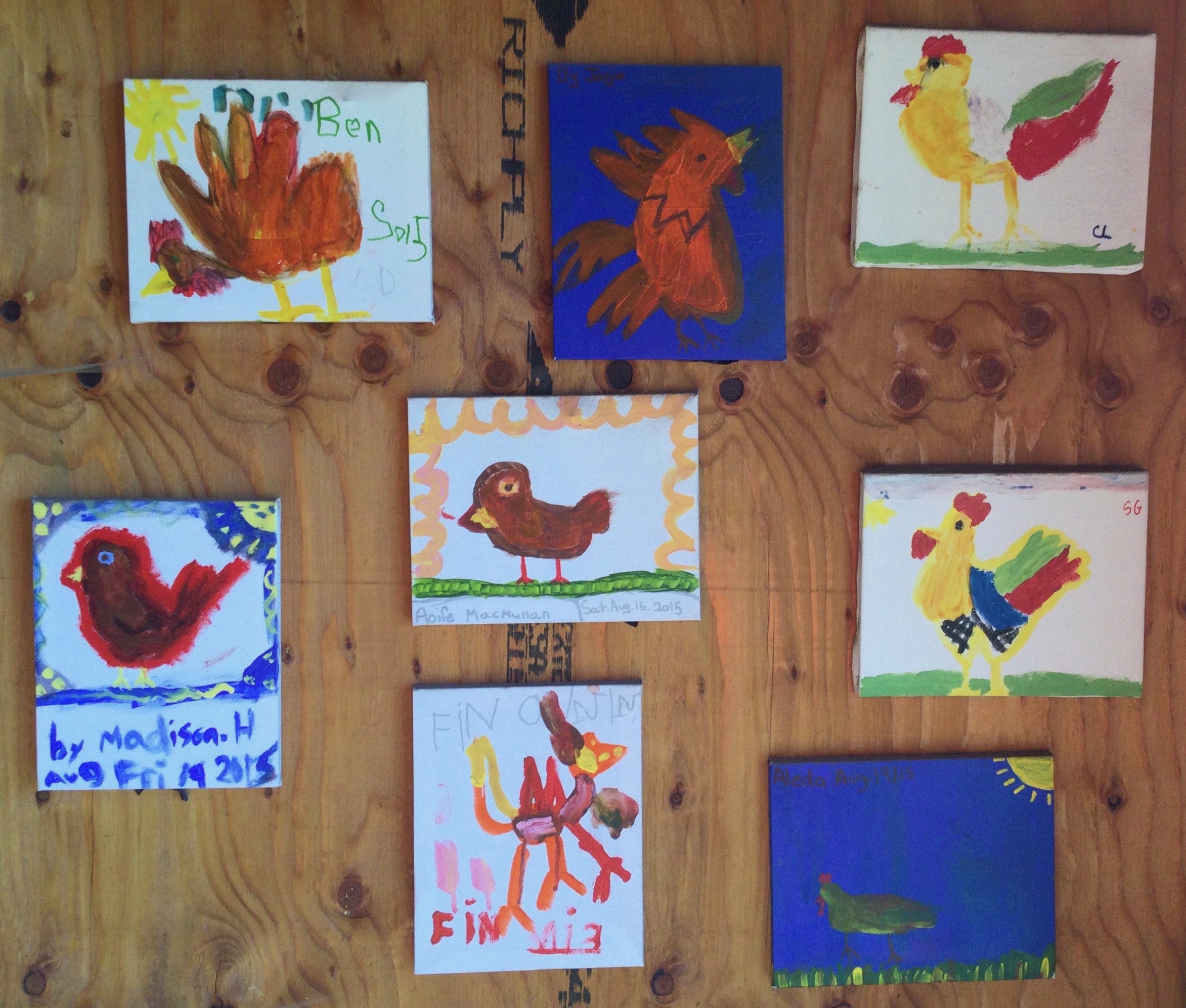 Danna Lewis, a 4th generation Gabriola Islander invites her friends and family that visit over the summer to do a painting of a chicken. The following were done by her grandchildren Cameron and Ben Lewis, aunt Rue and cousins Sienna Gale and Jorja Armstrong.