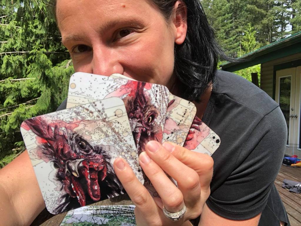 As an artist and author living and working on Gabriola Island I am often inspired, and often amused, by the eccentricities we count as normal. Once, while walking our dogs on one of the many forest trails, we came across a mass of black and white feathers. A few paces on and suddenly our Bully plunged into the bush and came nose to beak with a chicken who, oddly, seemed somewhat nonplussed by the encounter. Chickens are not terribly good at living alone in the wild so we knew we couldn’t leave it to fend for itself. I took the dogs back to the car while my partner stumbled through deep bush and bracken chasing the chicken that danced gracefully through the forest tantalizingly out of reach. I lost track of him for a time, but finally he came limping back on to the trail. His backside was swollen and inflamed by a bee sting and his ankle wrenched from catching in dense underbrush and deadfall, but triumphantly holding a now perfectly docile chicken tucked into his shirt. A Silver Laced Wyandotte to be precise and very lovely she was, except for the fact that she no longer had a tail, thus the abundance of loose feathers.